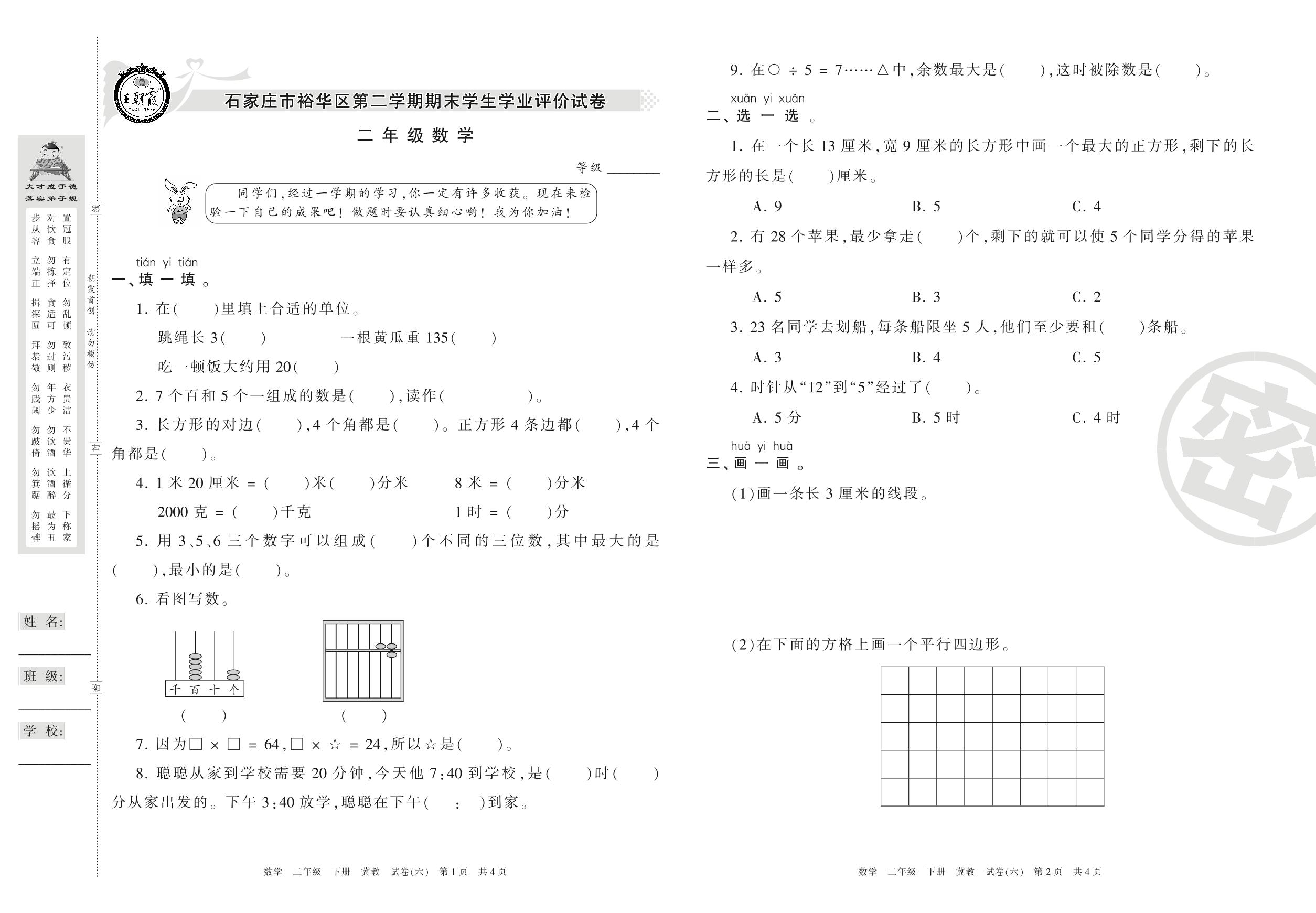 2015-2016学年第二学期石家庄市裕华区二年级数学试卷(冀教版)【6】