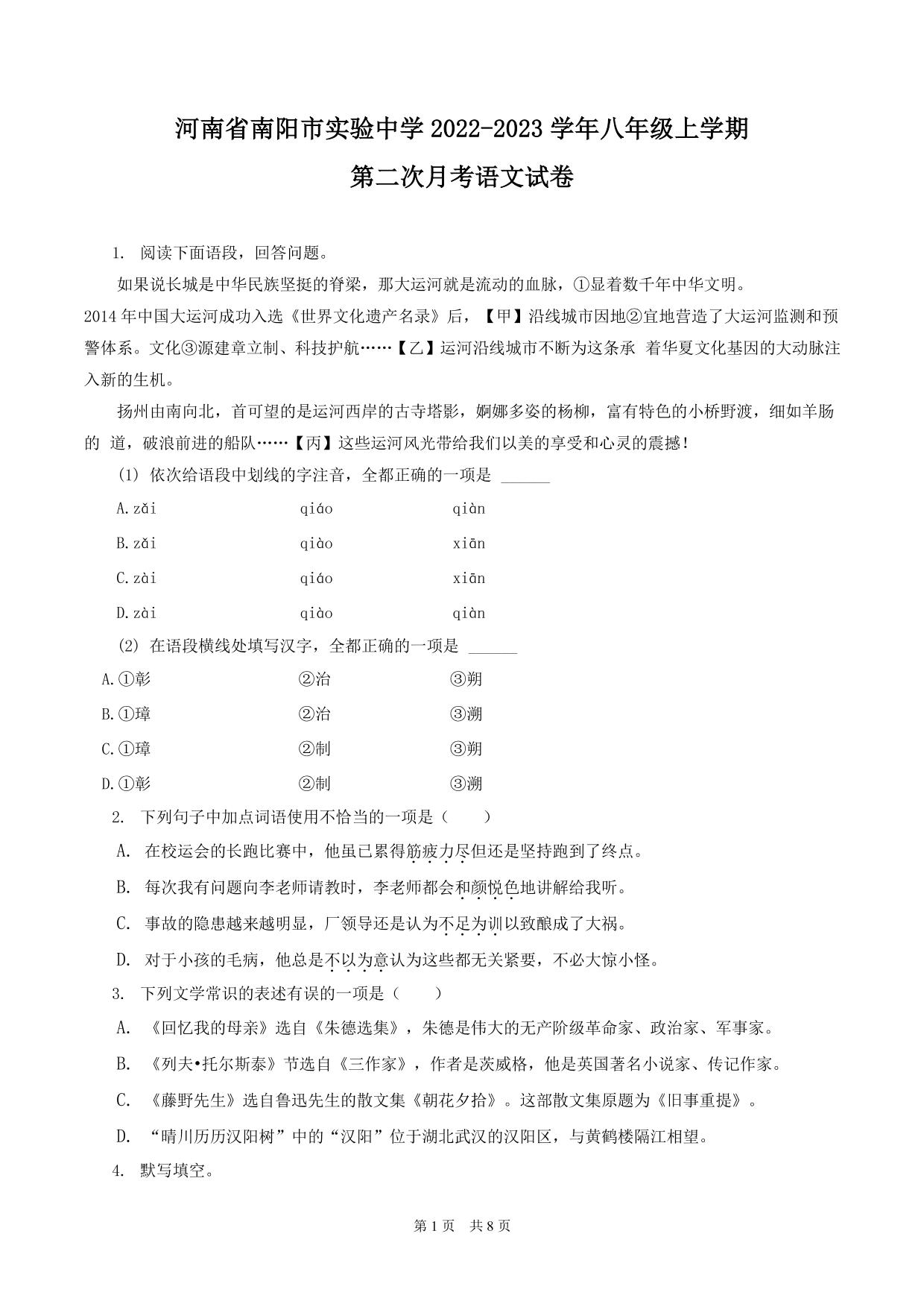 河南省南阳市实验中学2022-2023学年八年级上学期第二次月考语文试卷