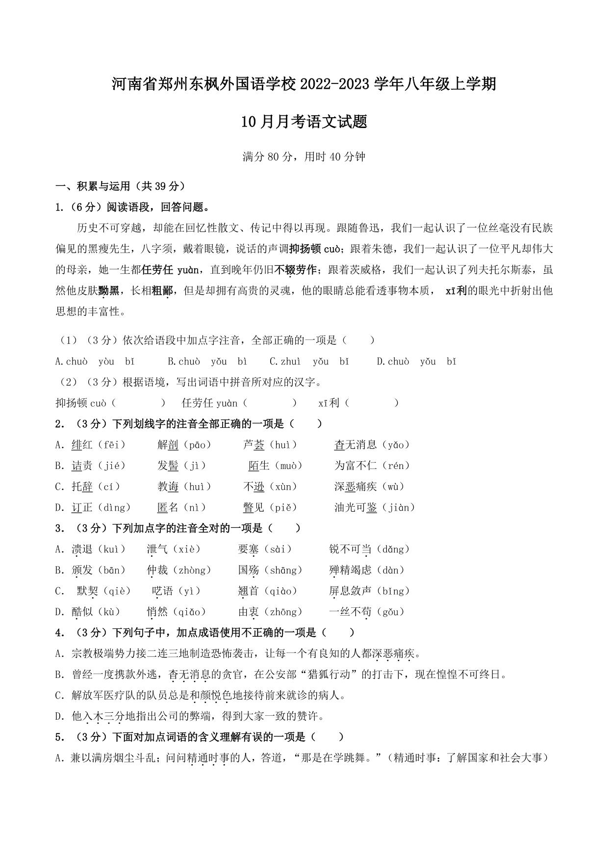 河南省郑州东枫外国语学校2022-2023学年八年级上学期10月月考语文试题