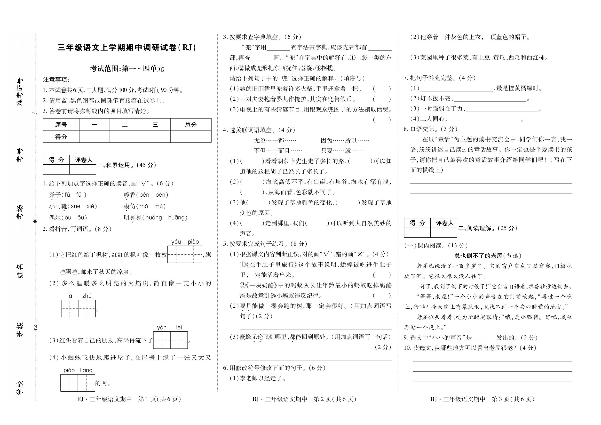三年级语文人教版上册期中卷