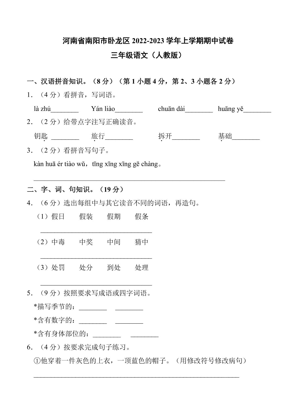 河南省南阳市卧龙区2022-2023学年上学期期中试卷三年级语文(人教版)