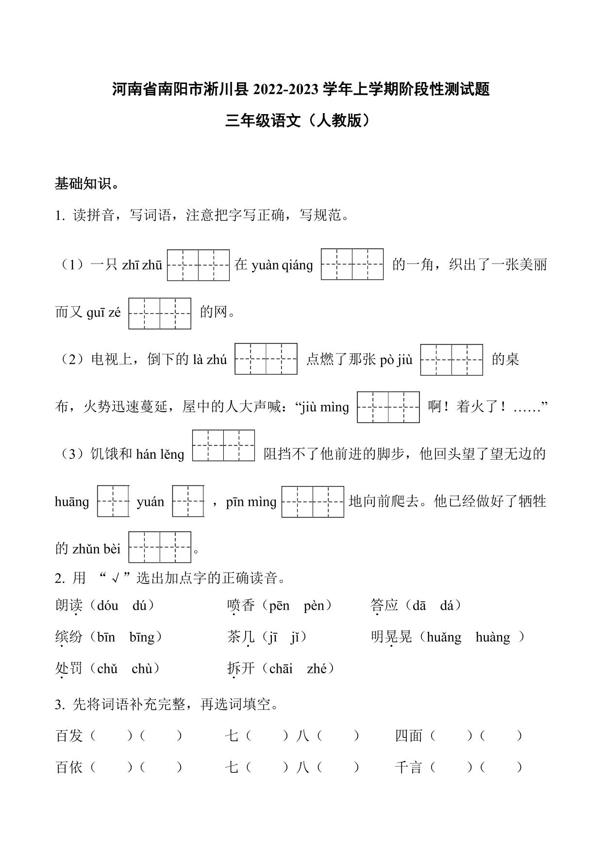 河南省南阳市淅川县2022-2023学年上学期阶段性测试题三年级语文(人教版)