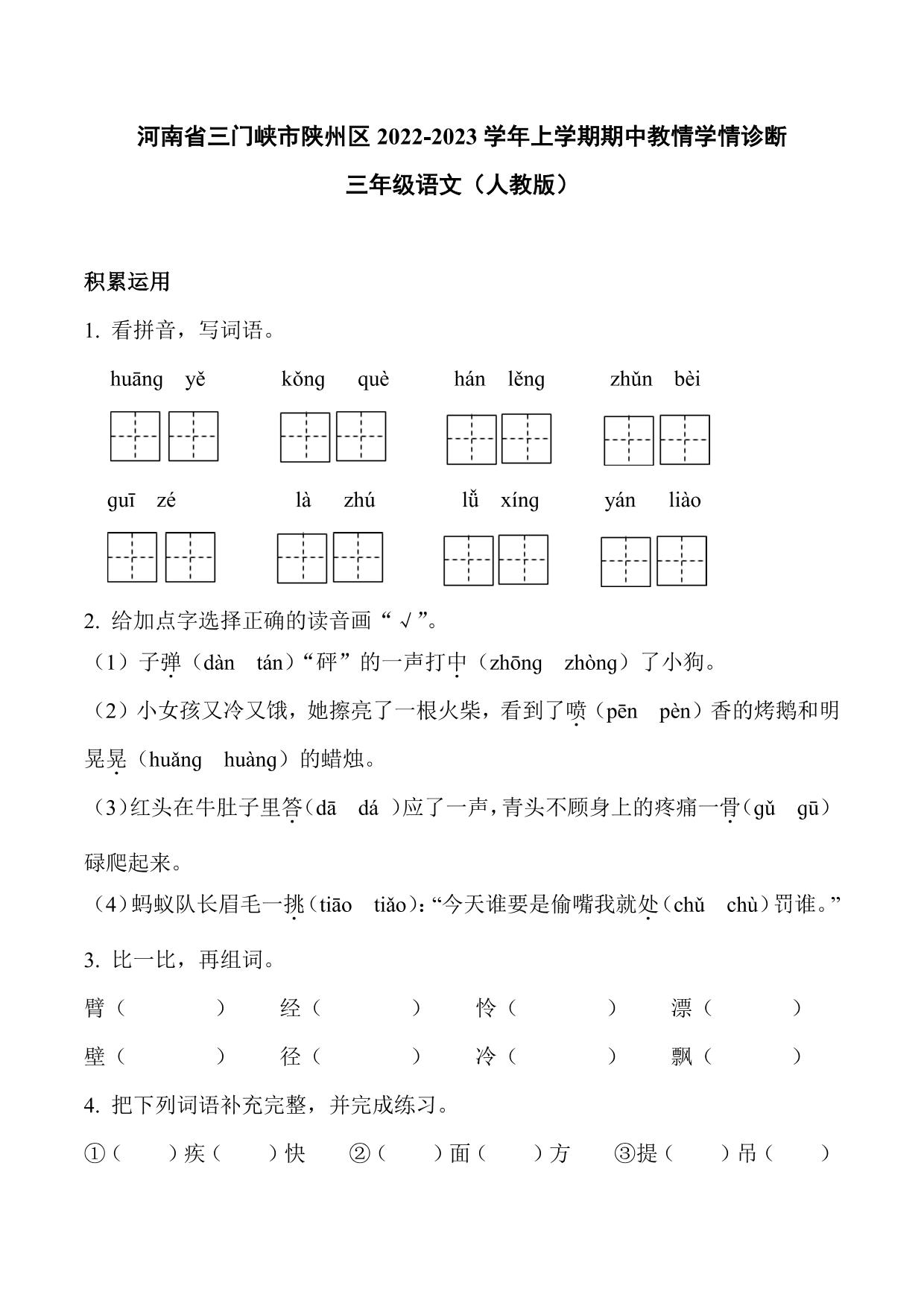 河南省三门峡市陕州区2022-2023学年上学期期中教情学情诊断三年级语文(人教版)