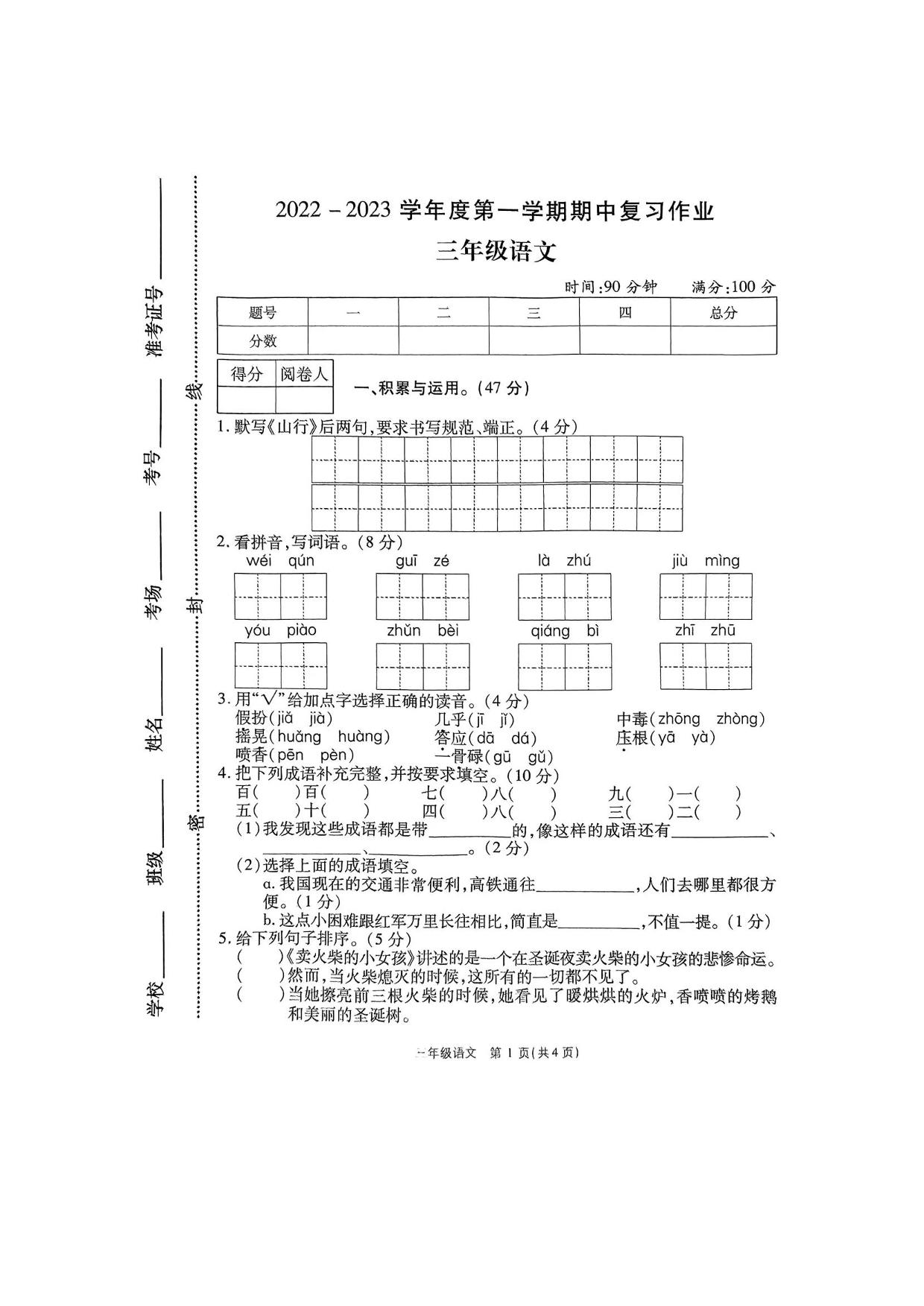河南省周口市沈丘县某校2022-2023学年度第一学期期中复习作业三年级语文(人教版)