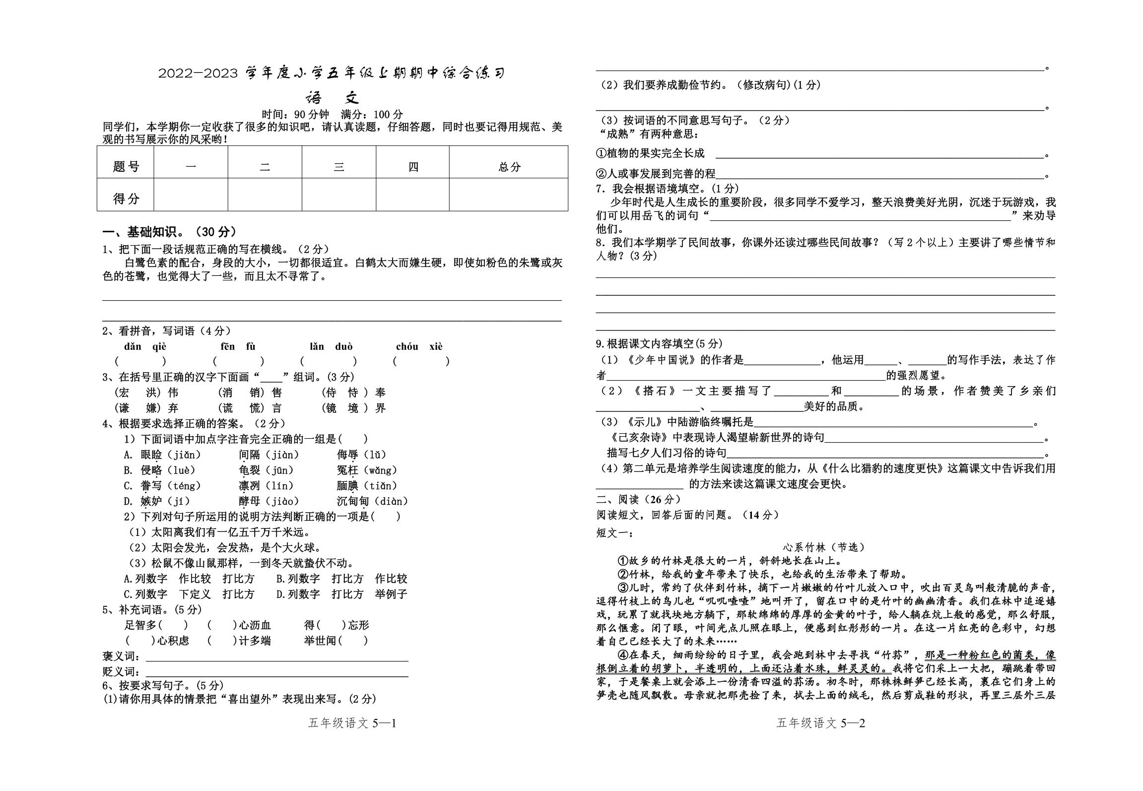 河南省信阳市淮滨县2022-2023学年度上期期中综合练习五年级语文(人教版)