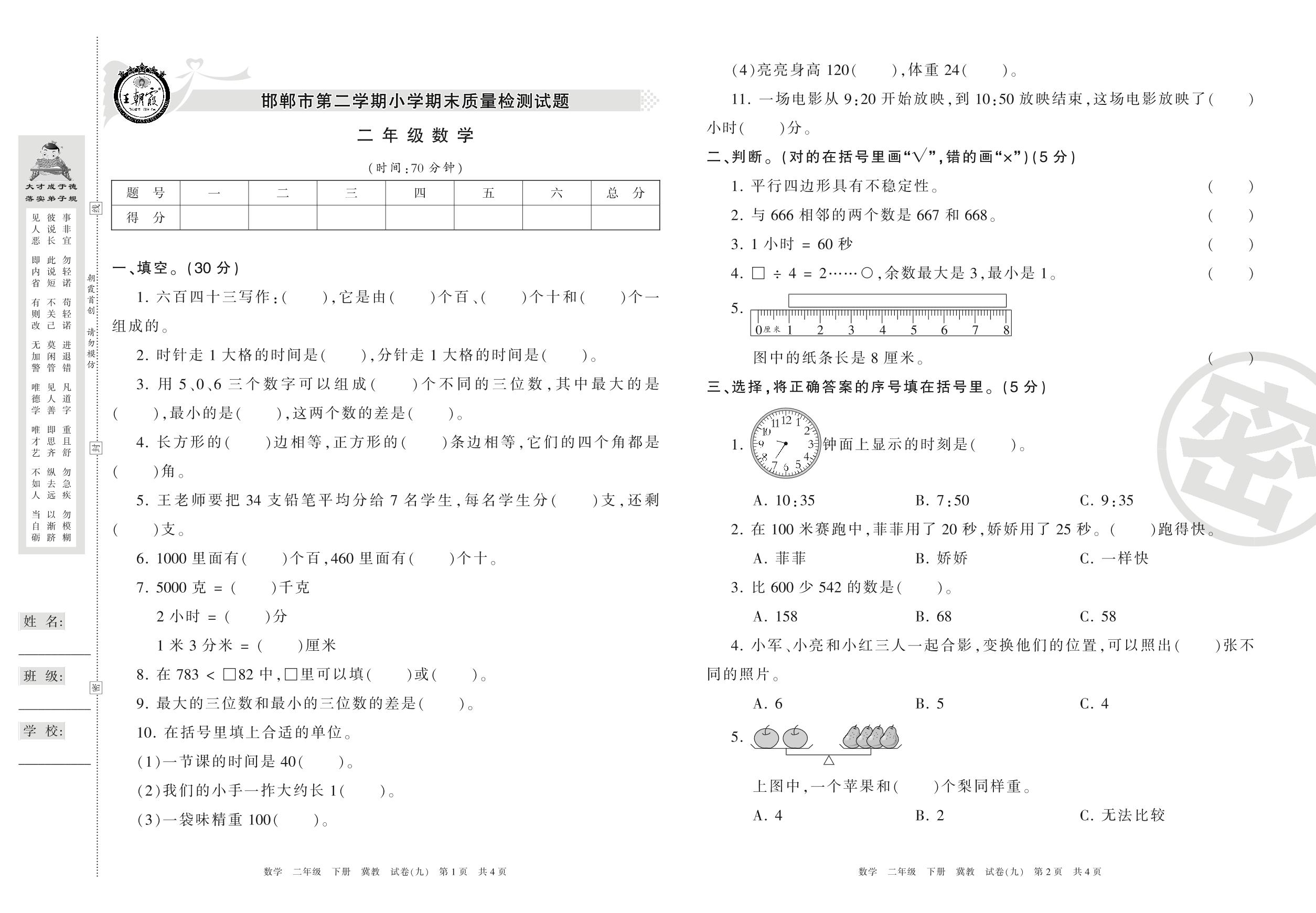 2015-2016学年第二学期邯郸市二年级数学试卷(冀教版)【9】