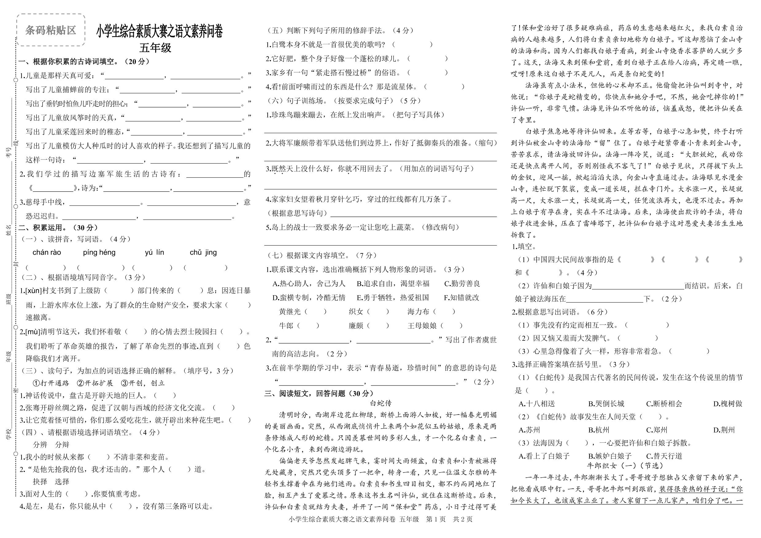 河南省驻马店市确山县2022-2023学年上学期期中素养问卷五年级语文(人教版)