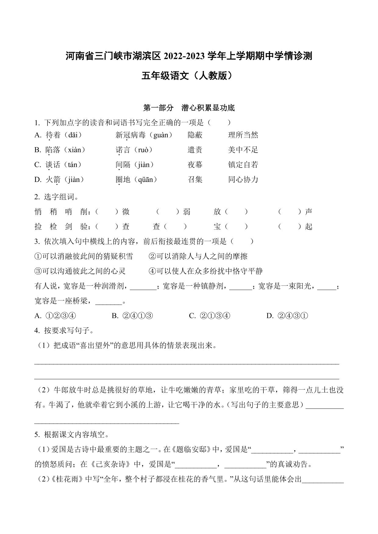 河南省三门峡市湖滨区2022-2023学年上学期期中学情诊测五年级语文(人教版)