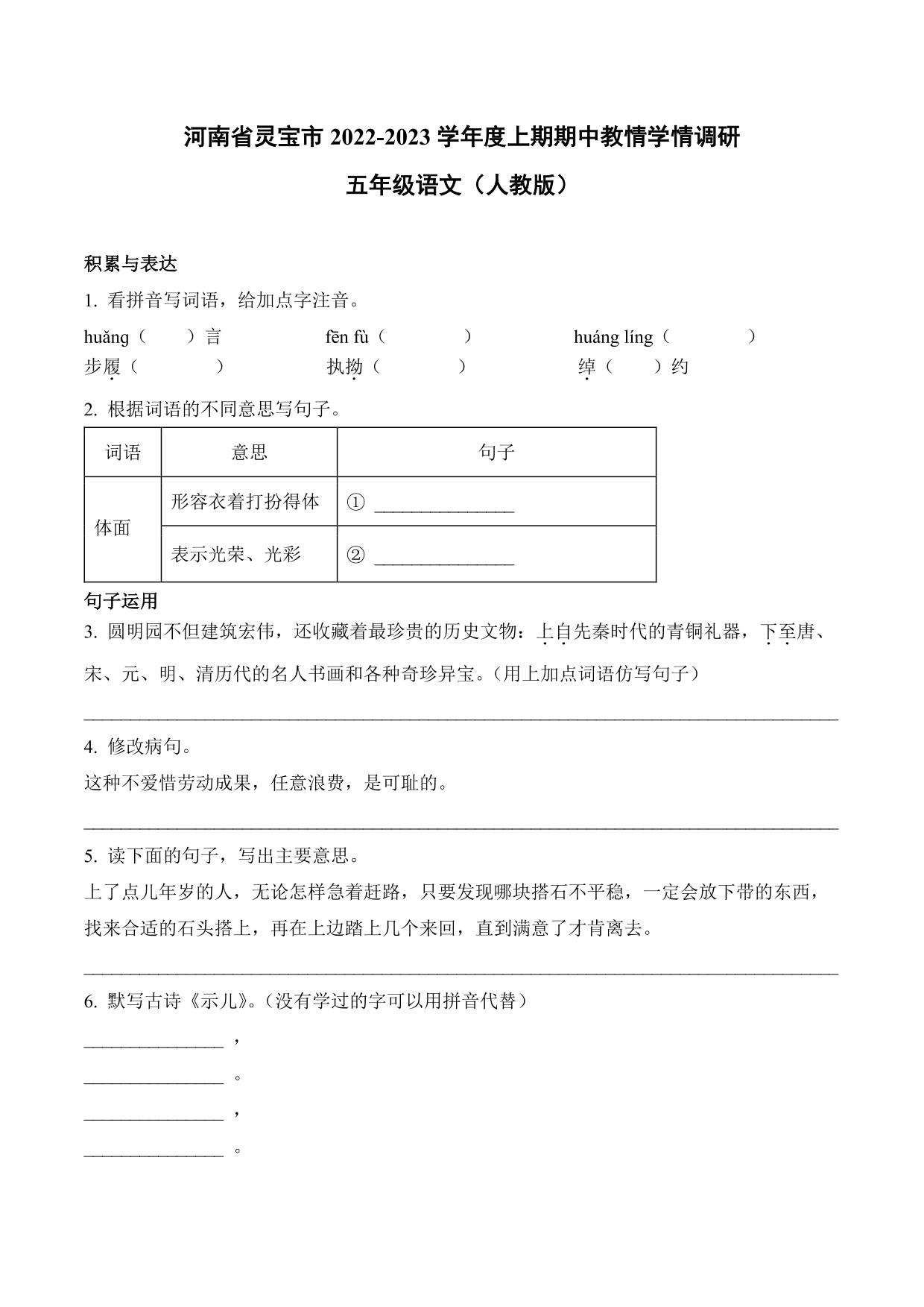 河南省灵宝市2022-2023学年度上学期期中教情学情调研五年级语文(人教版)