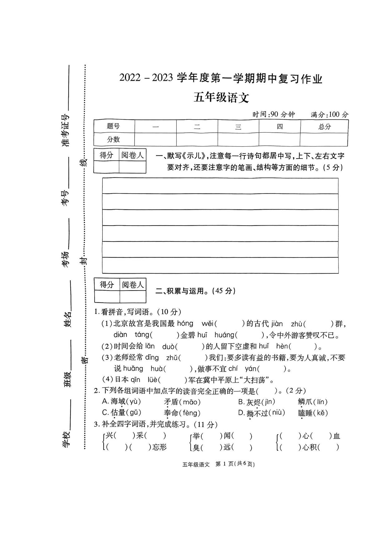五年级语文人教版上册期中卷