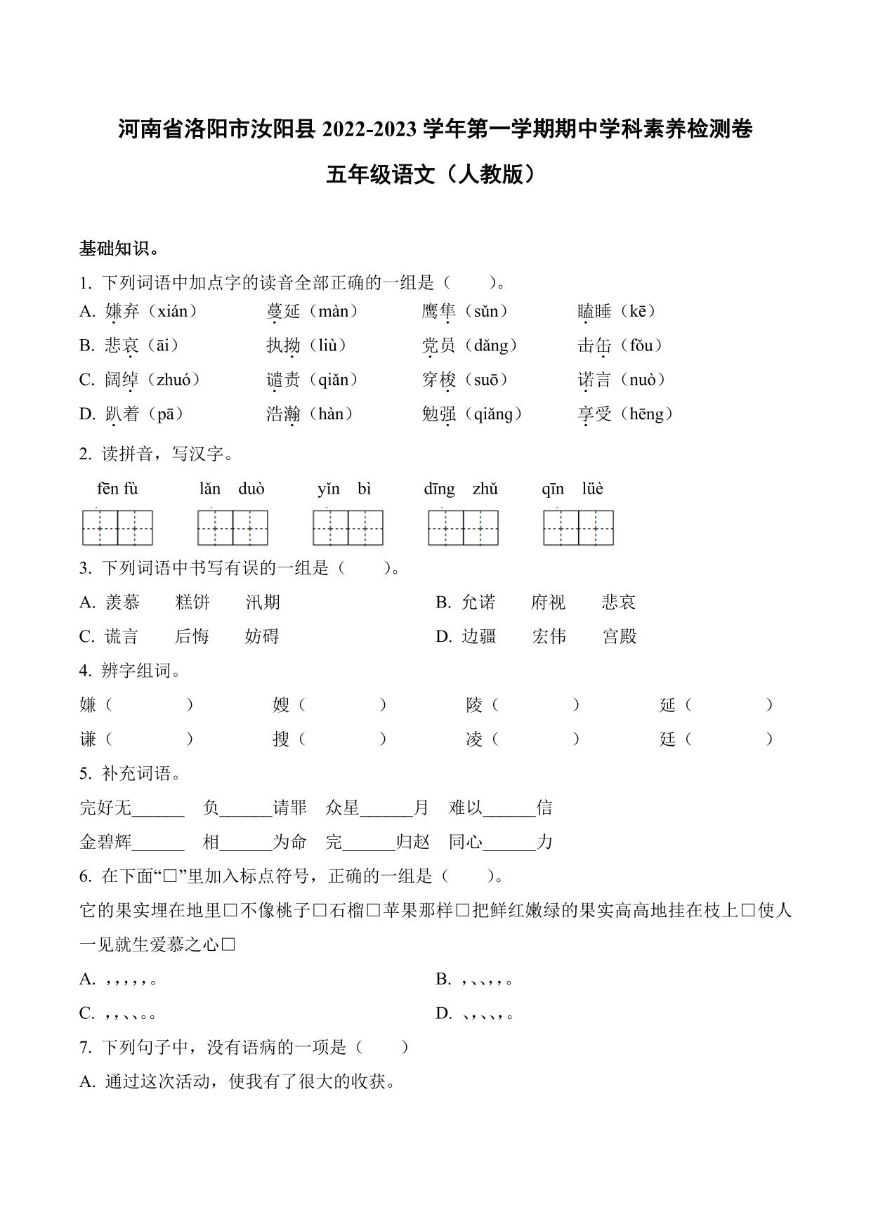 河南省洛阳市汝阳县2022-2023学年第一学期期中学科素养检测卷五年级语文(人教版)