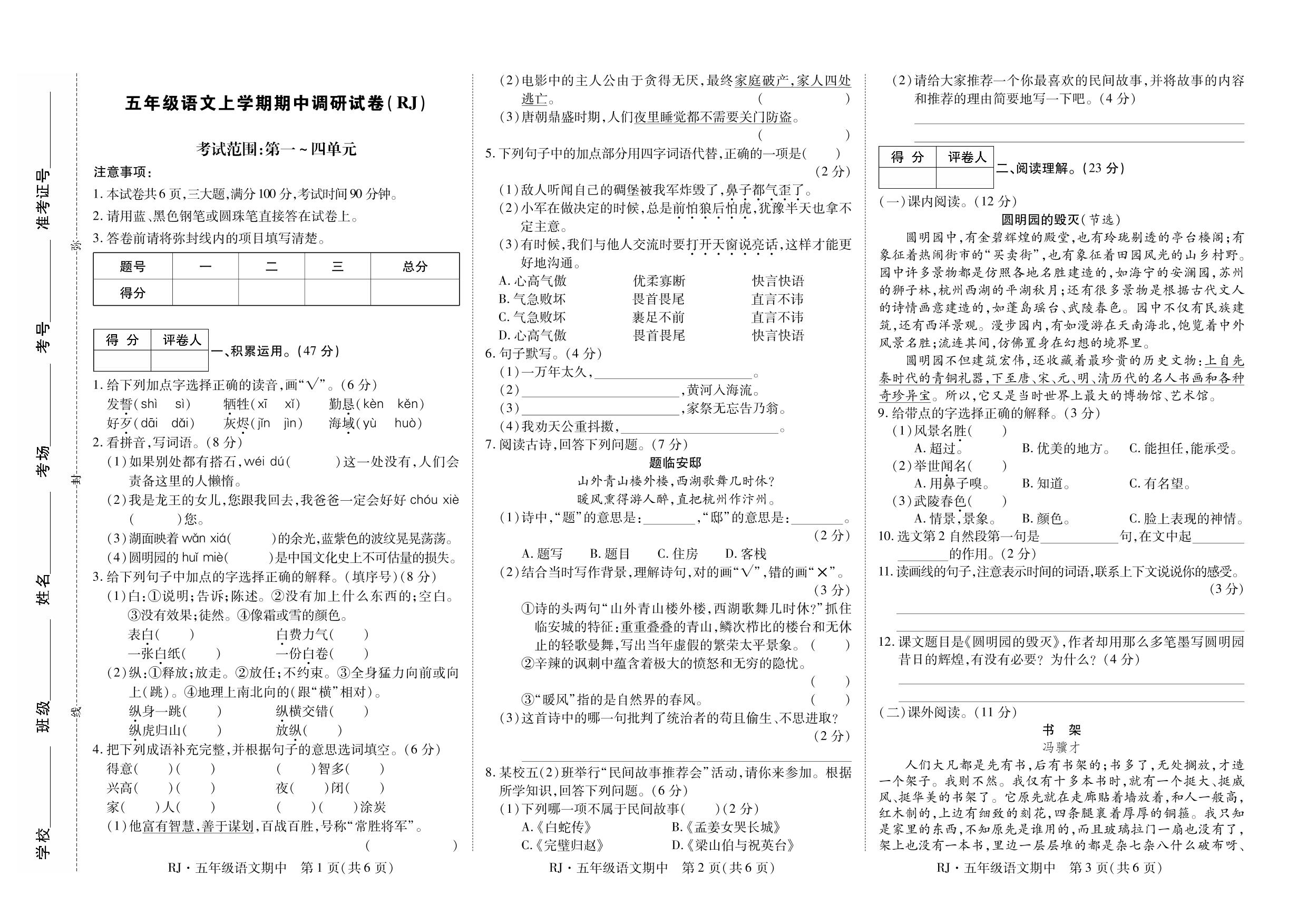 河南省洛阳市偃师区某校2022-2023学年上学期期中调研试卷五年级语文(人教版)