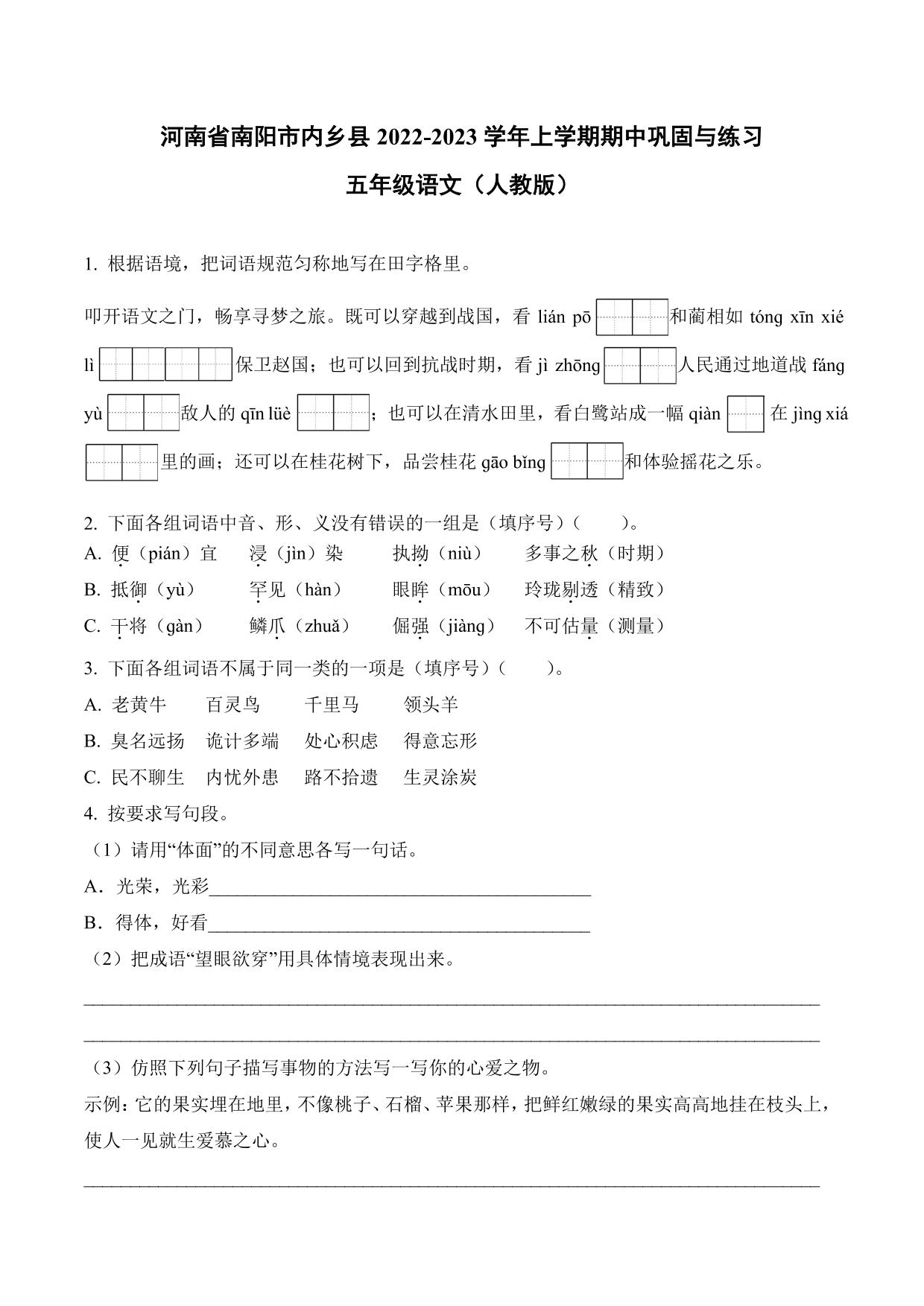 河南省南阳市内乡县2022-2023学年上学期期中巩固与练习五年级语文(人教版)