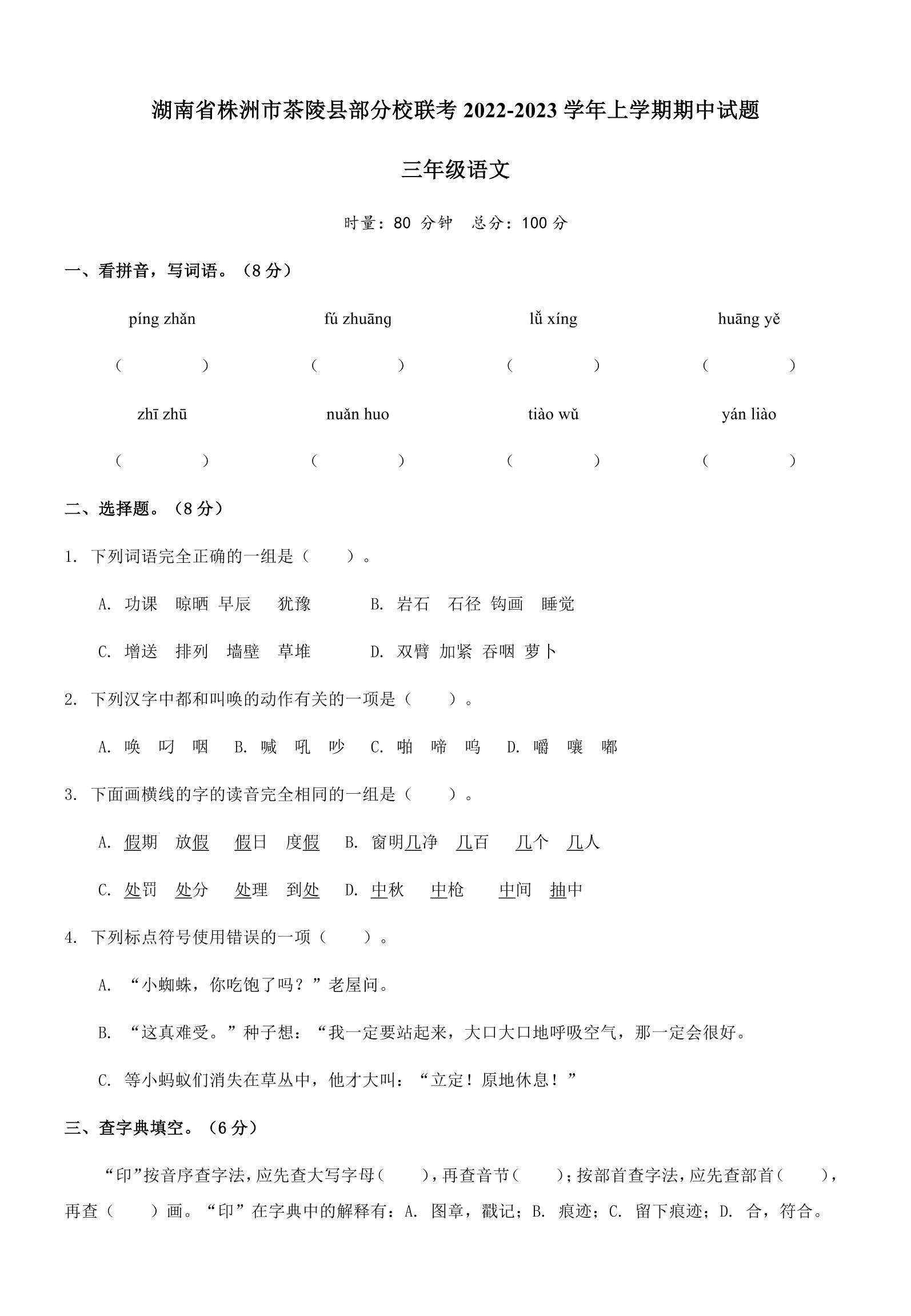 湖南省株洲市茶陵县部分校联考2022-2023学年三年级上学期期中语文试题(人教版)