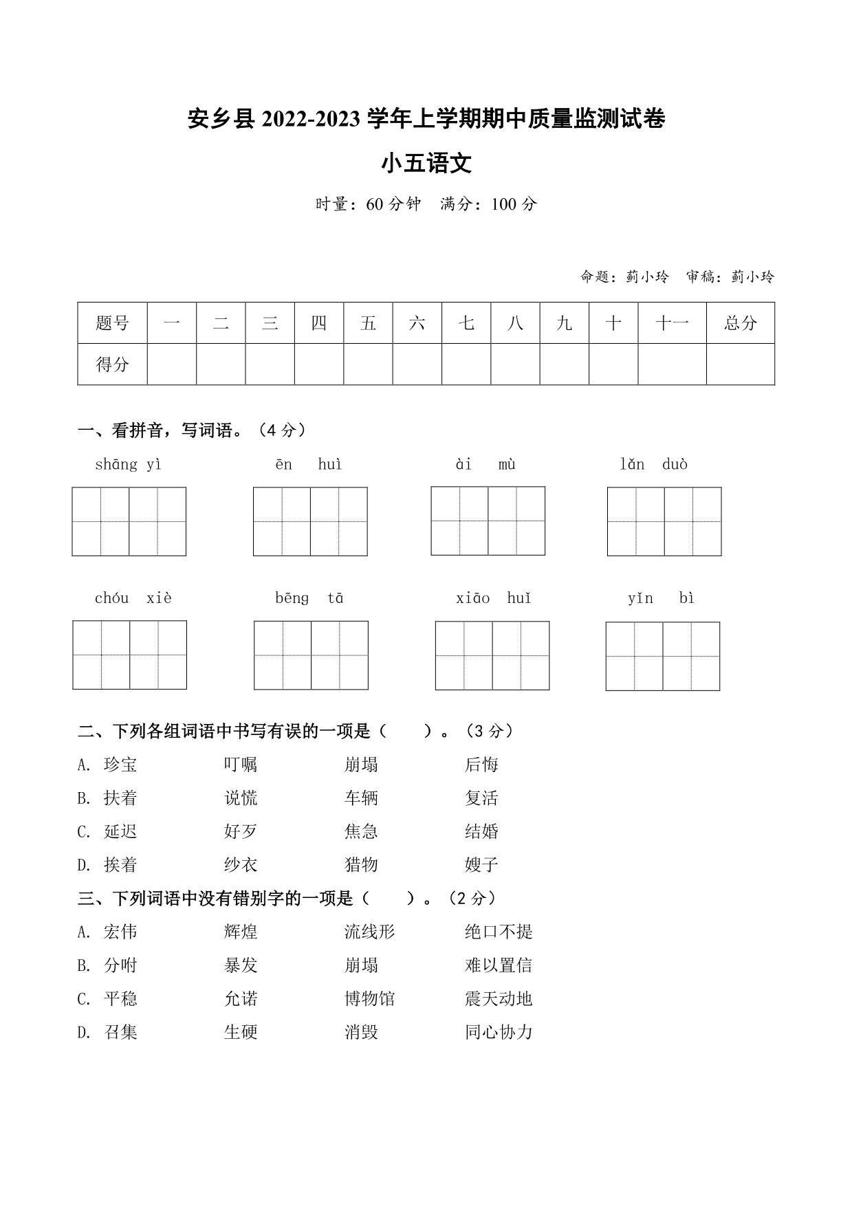 湖南省常德市安乡县2022-2023学年五年级上学期期中质量监测语文试题(人教版)