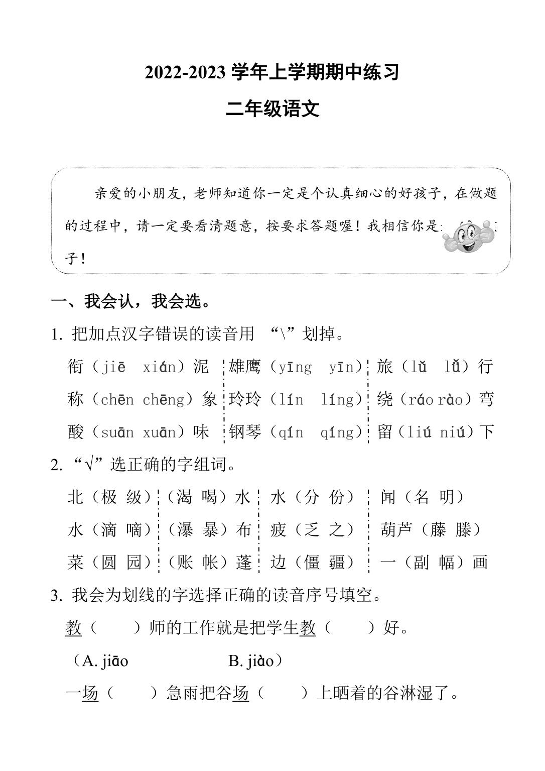 湖南省常德市汉寿县2022-2023学年二年级上学期期中考试语文试题(人教版)