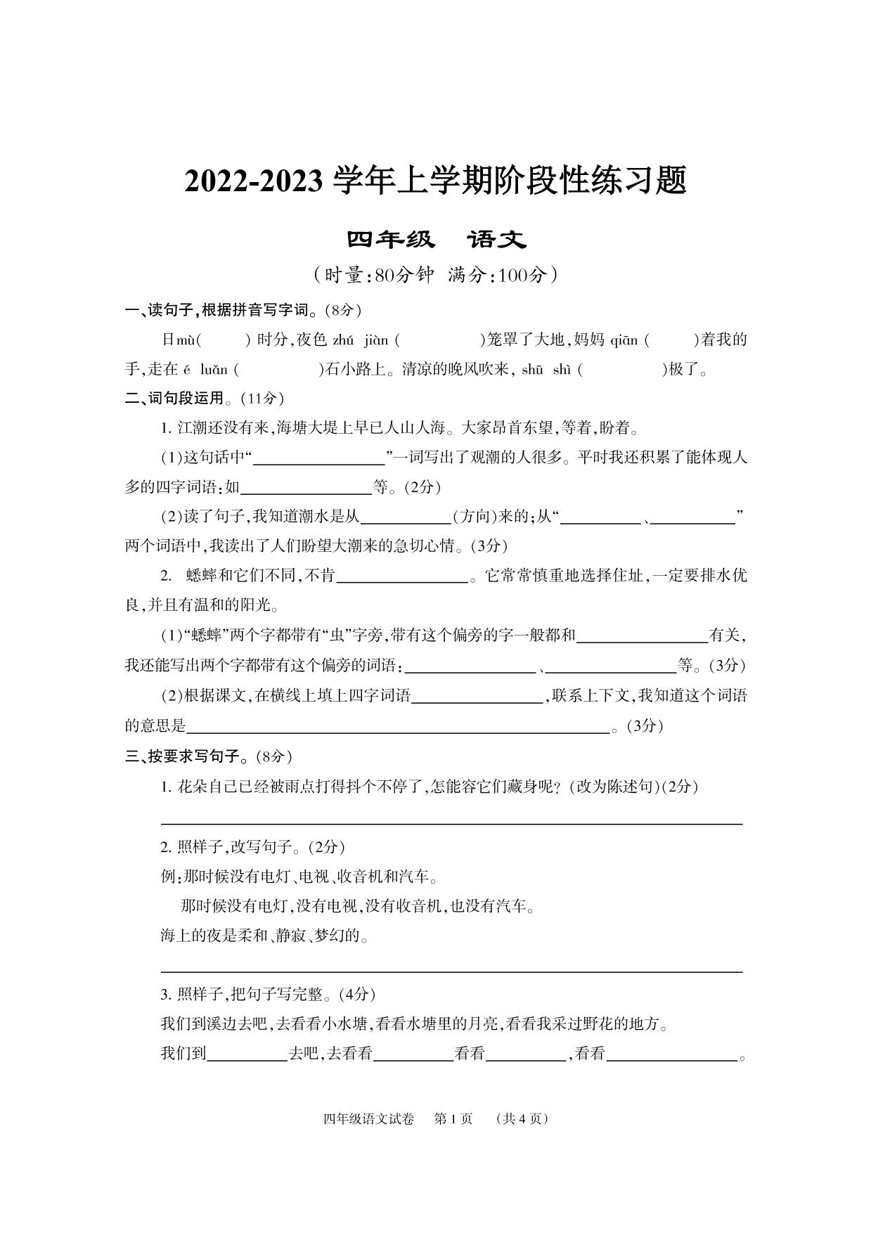 湖南省岳阳市临湘市2022-2023学年四年级上学期期中质量检测语文试题(人教版)