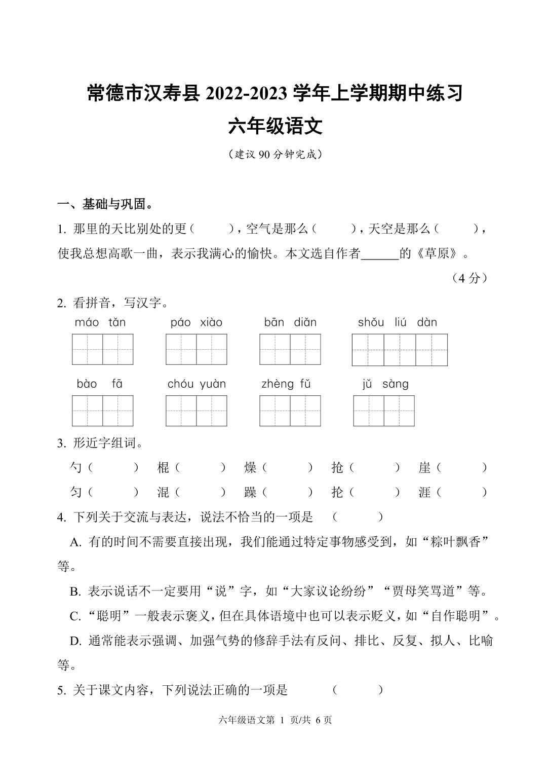 湖南省常德市汉寿县2022-2023学年六年级上学期期中考试语文试题(人教版)