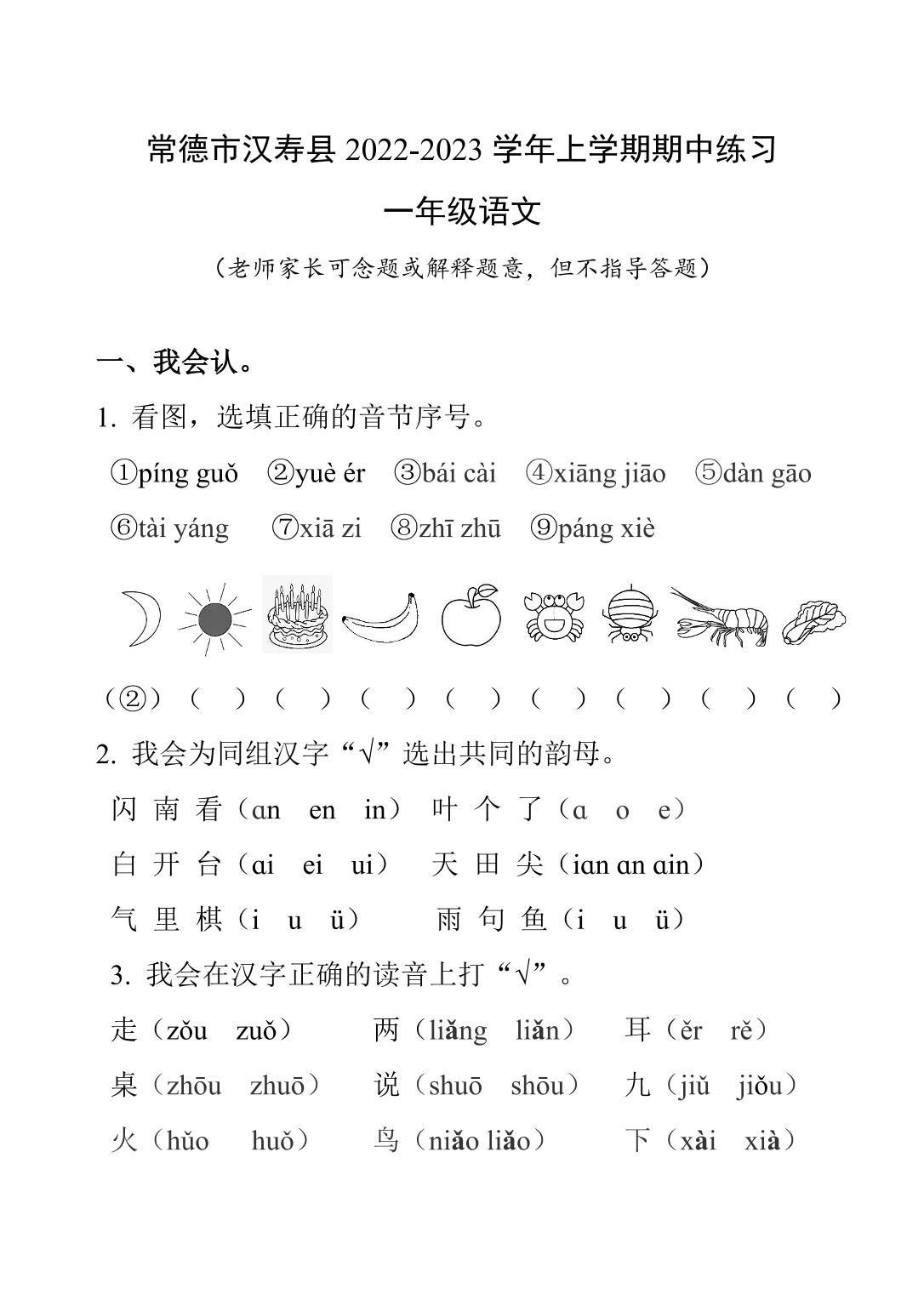 湖南省常德市汉寿县2022-2023学年一年级上学期期中考试语文试题(人教版)