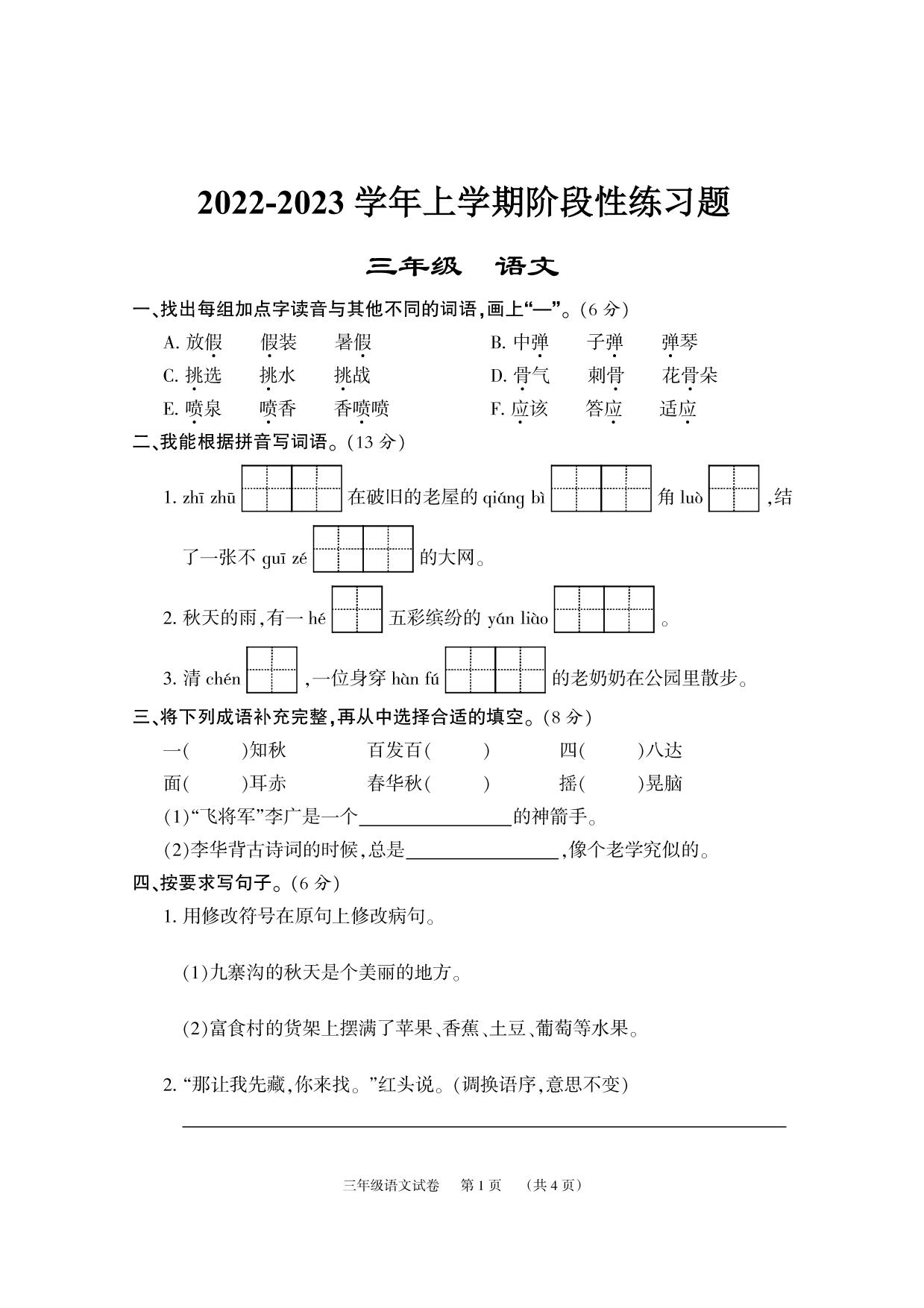 湖南省岳阳市临湘市2022-2023学年三年级上学期期中质量检测语文试题(人教版)