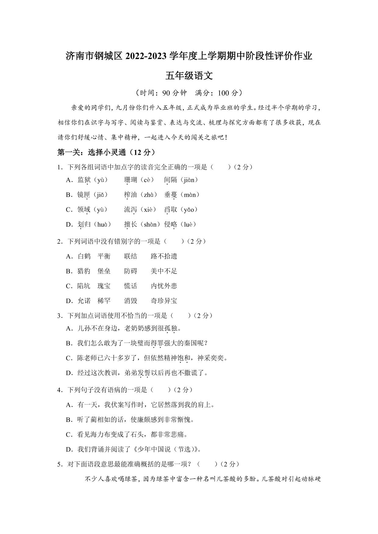 山东省济南市钢城区2022-2023学年五年级上学期期中阶段性评价作业语文试题(青岛版)