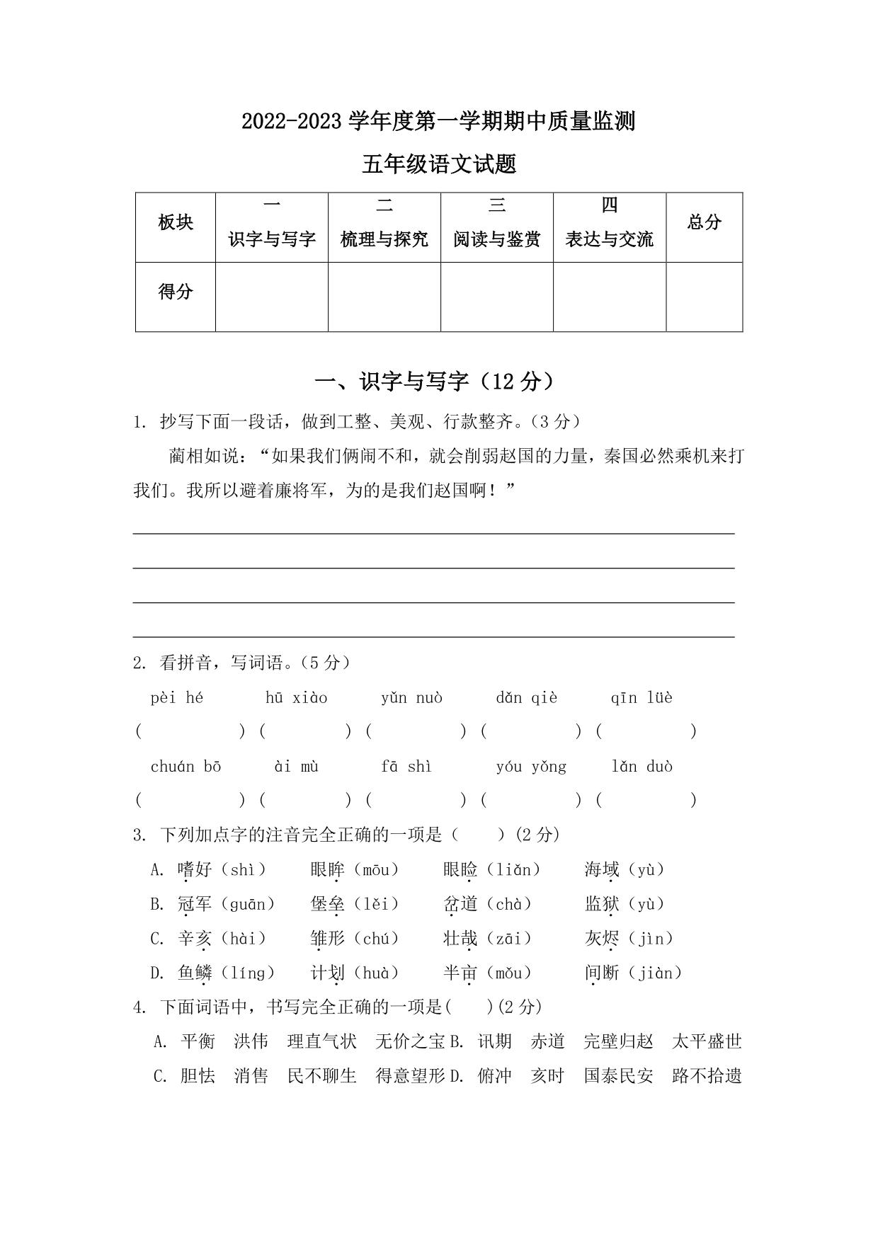 山东省菏泽市郓城县2022-2023学年五年级上学期期中考试语文试题(人教版)