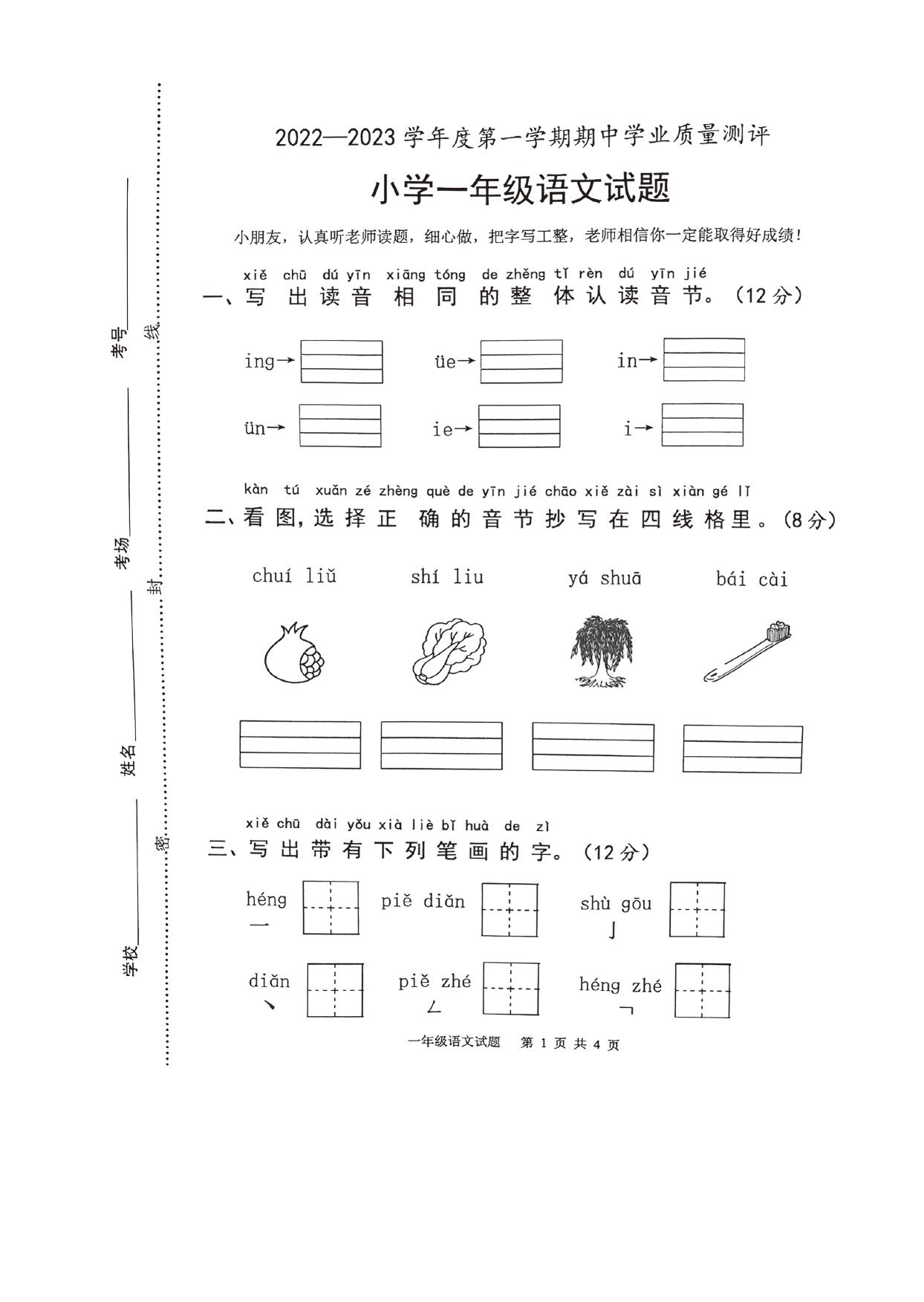 山东省菏泽市成武县2022-2023学年一年级上学期11月期中语文试题(人教版)