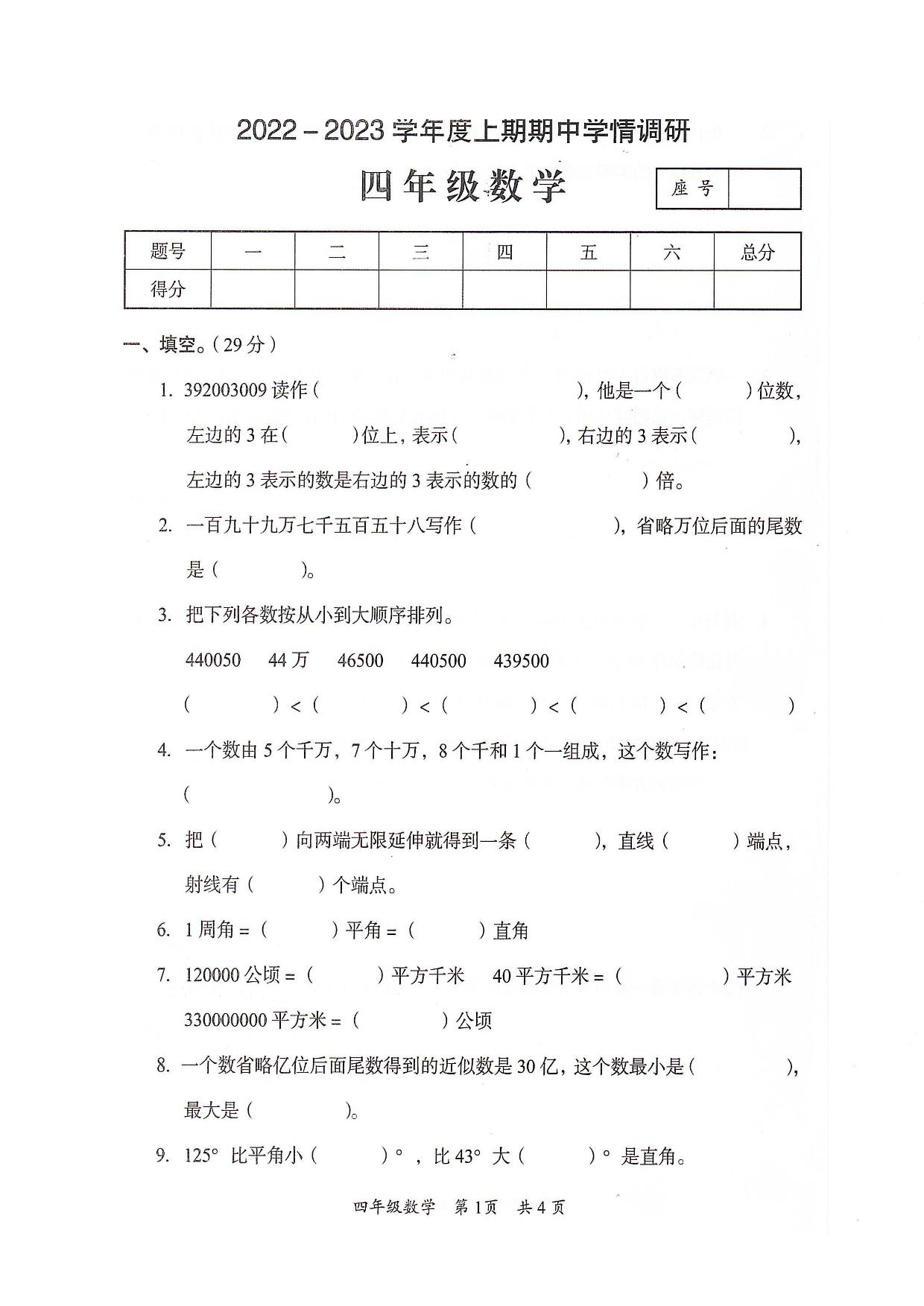 河南省驻马店市西平县2022-2023学年上学期期中学情调研试卷四年级数学(人教版)