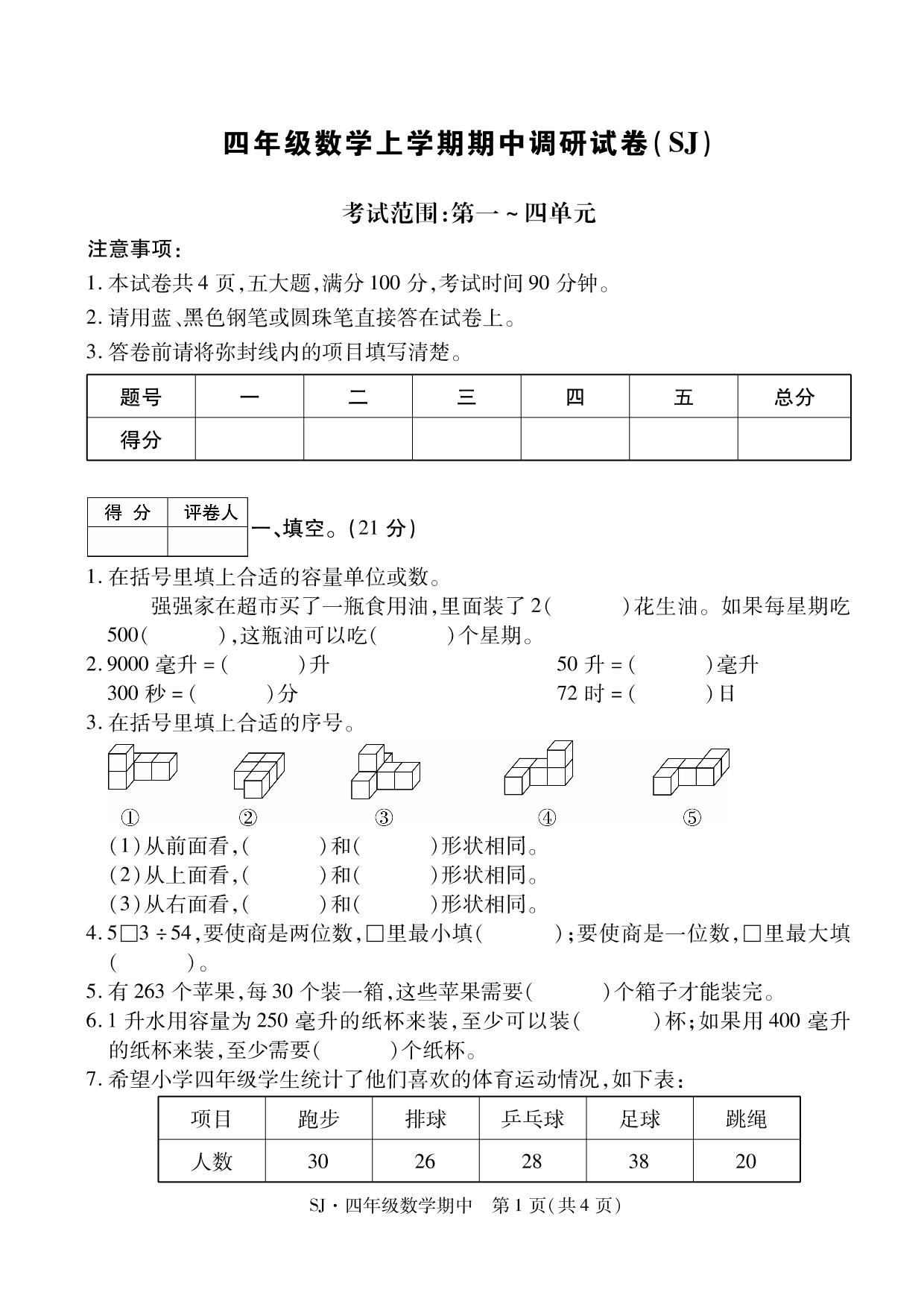 四年级数学苏教版上册期中卷