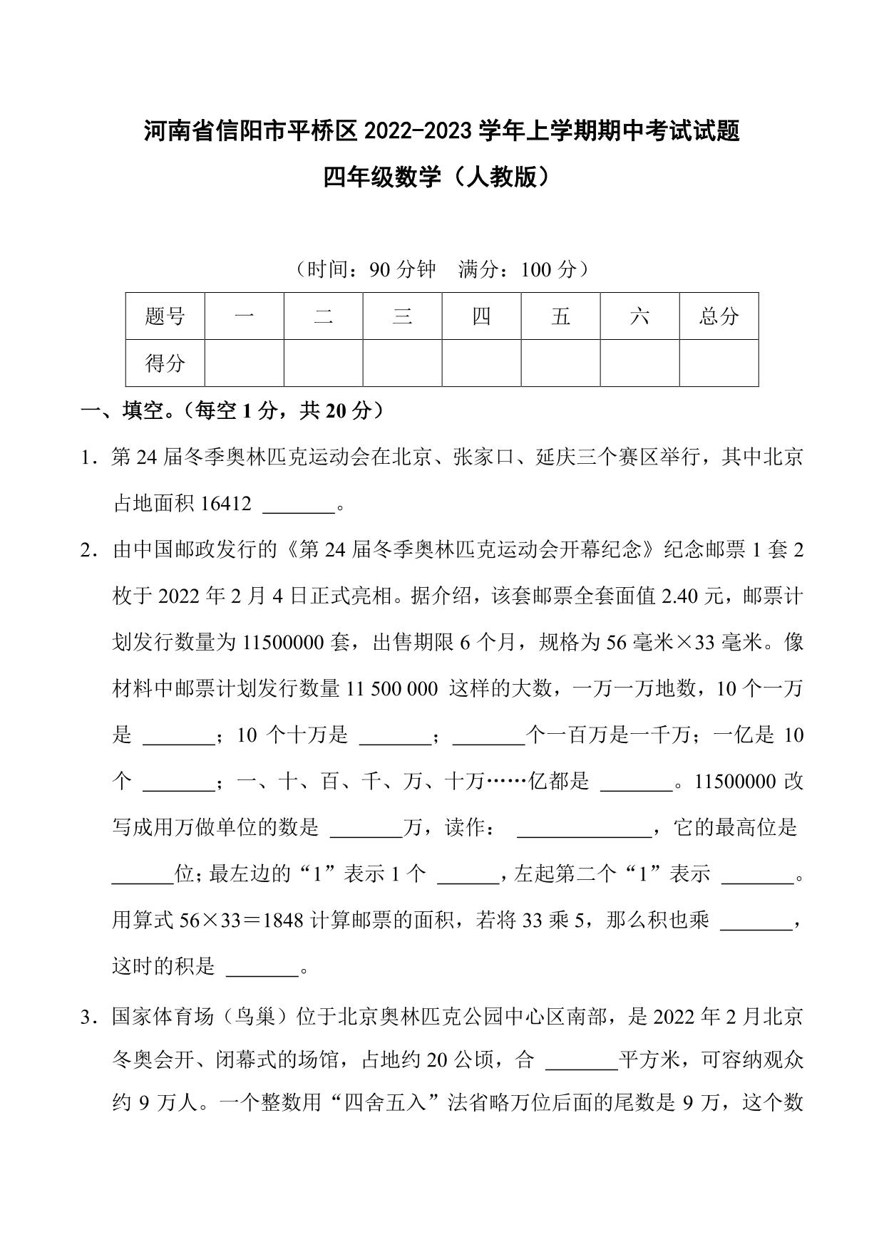 河南省信阳市平桥区2022-2023学年上学期期中考试试题四年级数学(人教版)