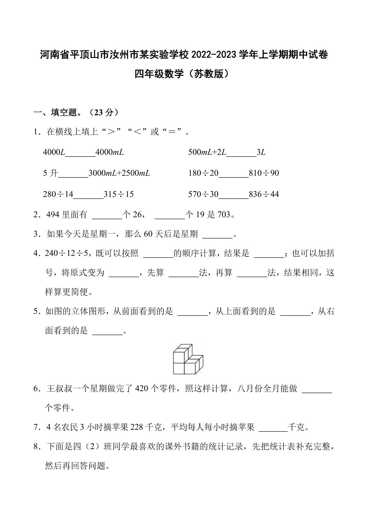 河南省平顶山市汝州市某实验学校2022-2023学年上学期期中试卷四年级数学(苏教版)