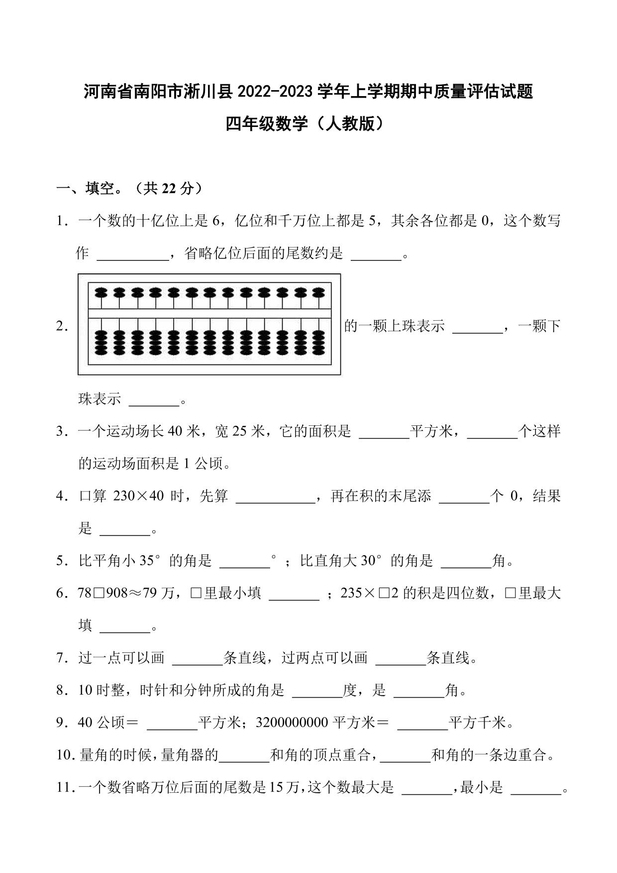 河南省南阳市淅川县2022-2023学年上学期期中质量评估试题四年级数学(人教版)