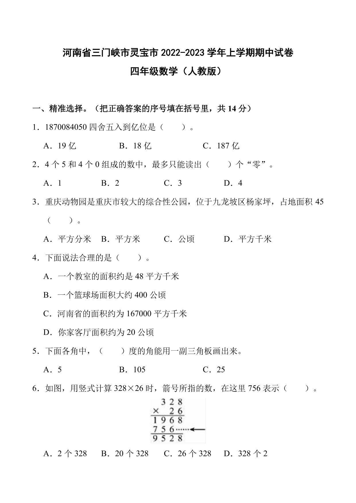河南省三门峡市灵宝市2022-2023学年上学期期中试卷四年级数学(人教版)