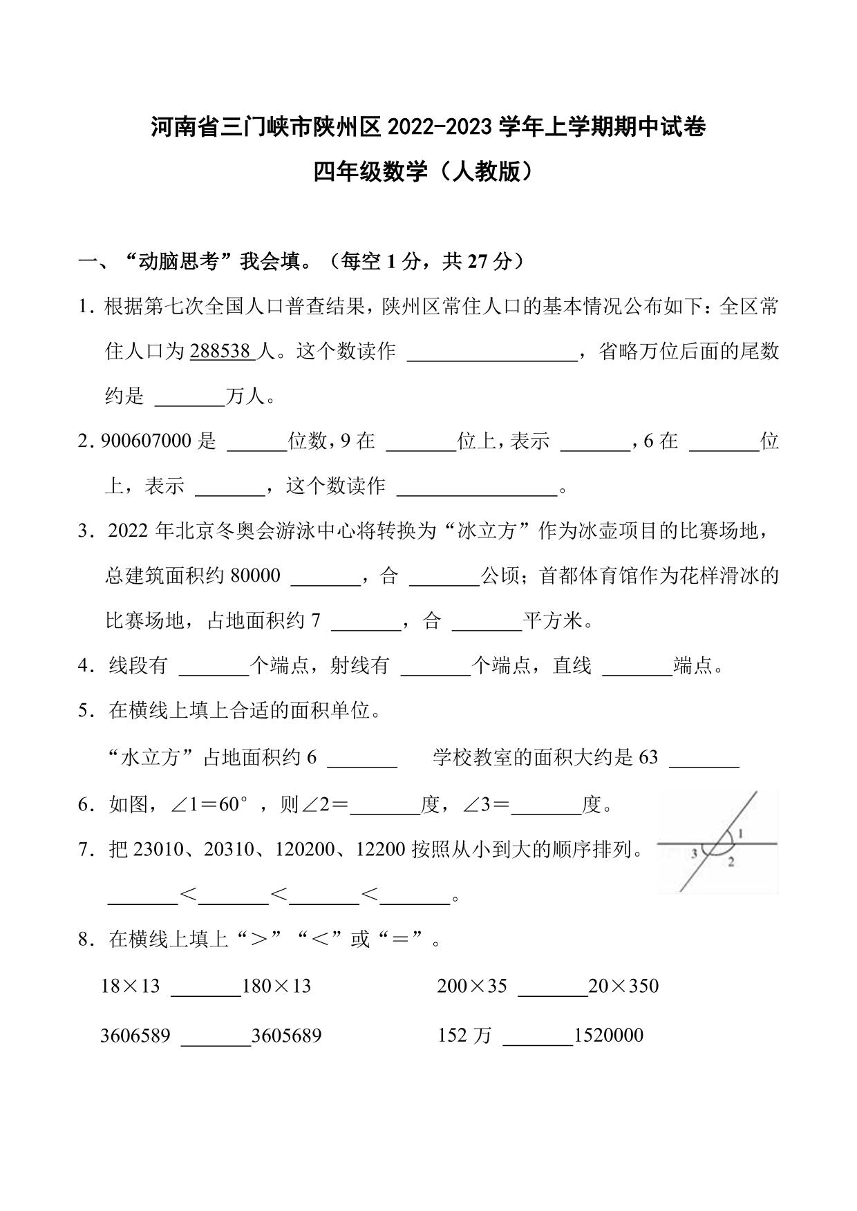 河南省三门峡市陕州区2022-2023学年上学期期中试卷四年级数学(人教版)