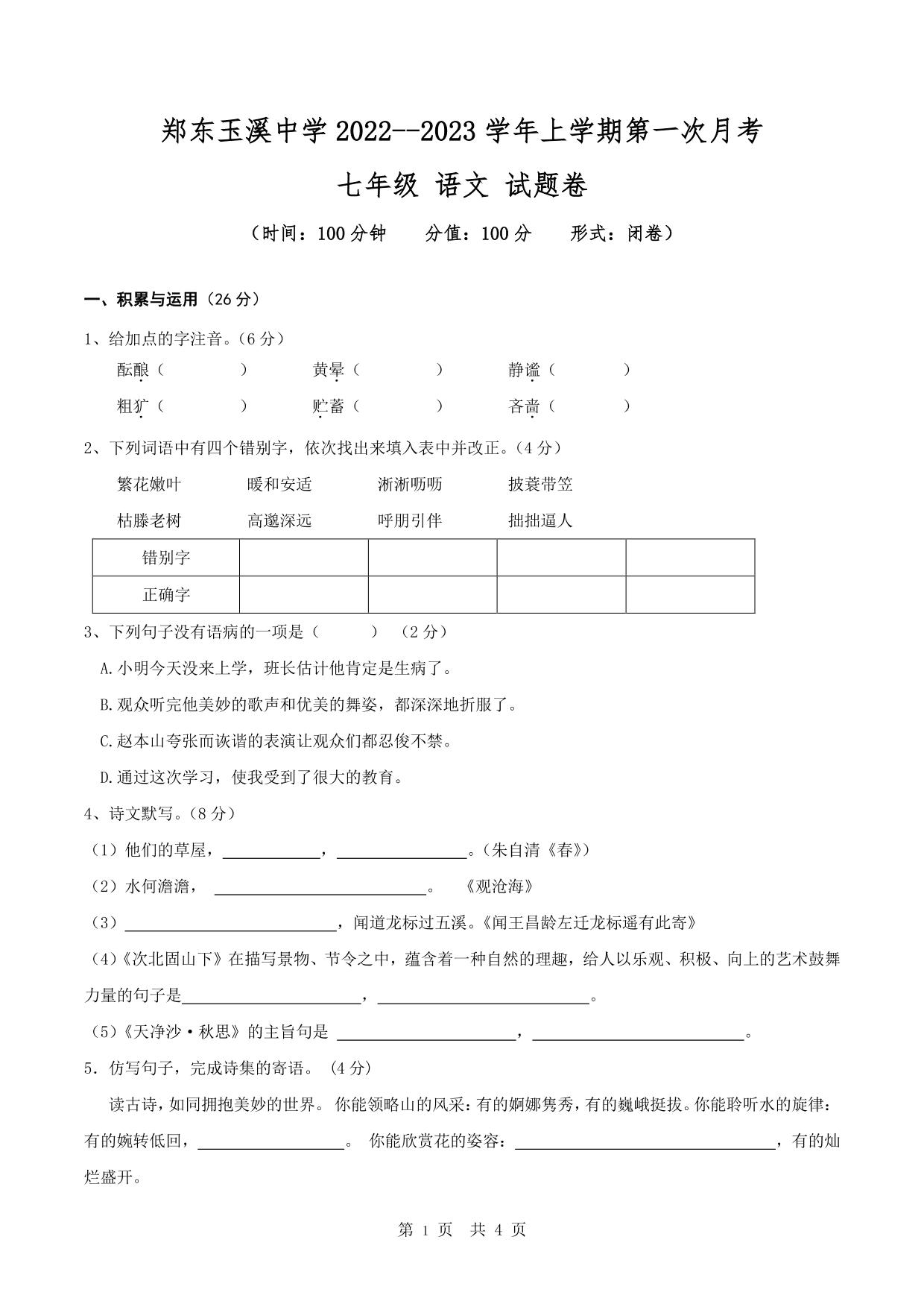 河南省郑州市郑东新区玉溪初级中学2022-2023学年七年级上学期第一次月考语文试题