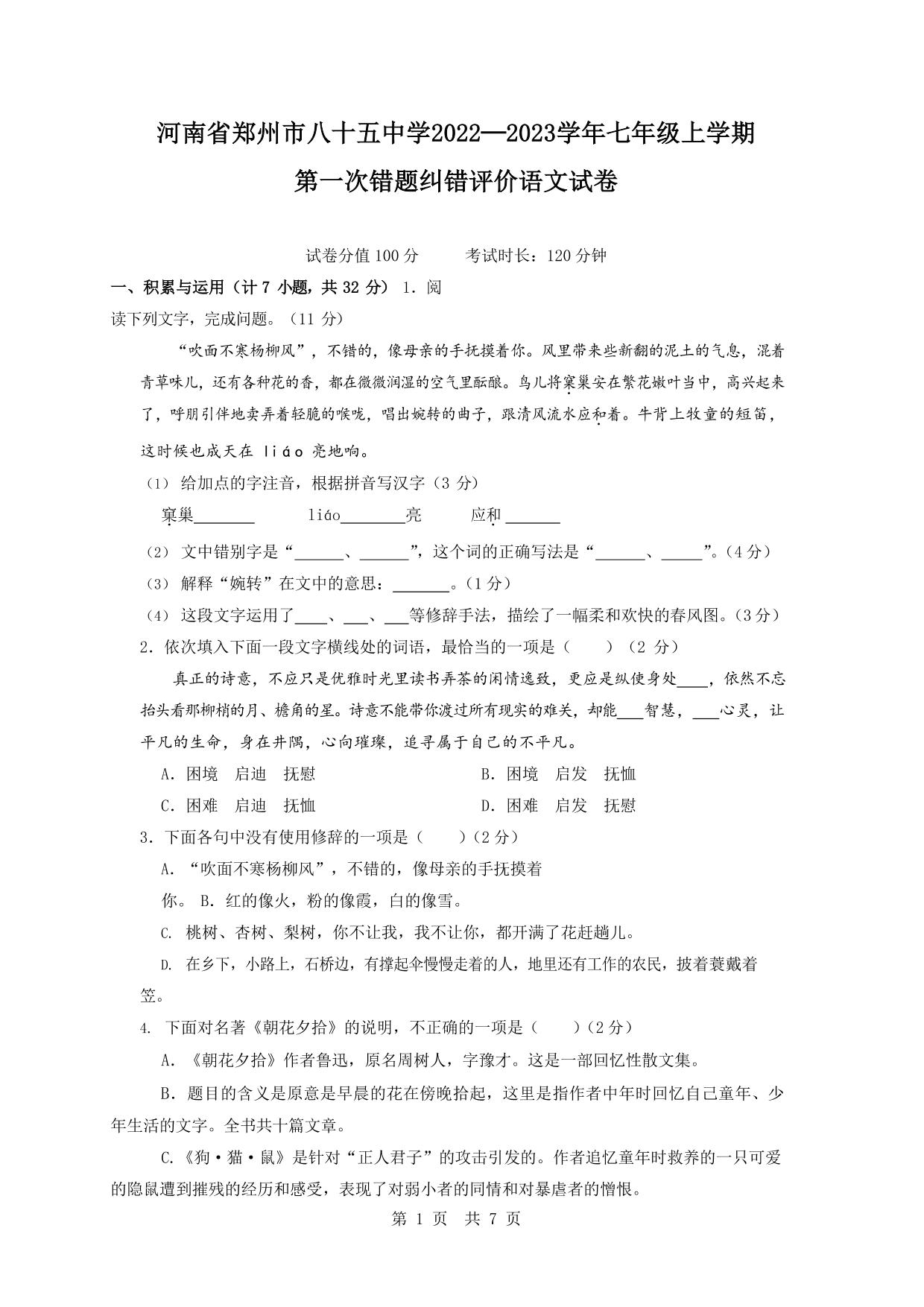 河南省郑州市第八十五中学2022-2023学年七年级上学期第一次错题纠错评价语文试题