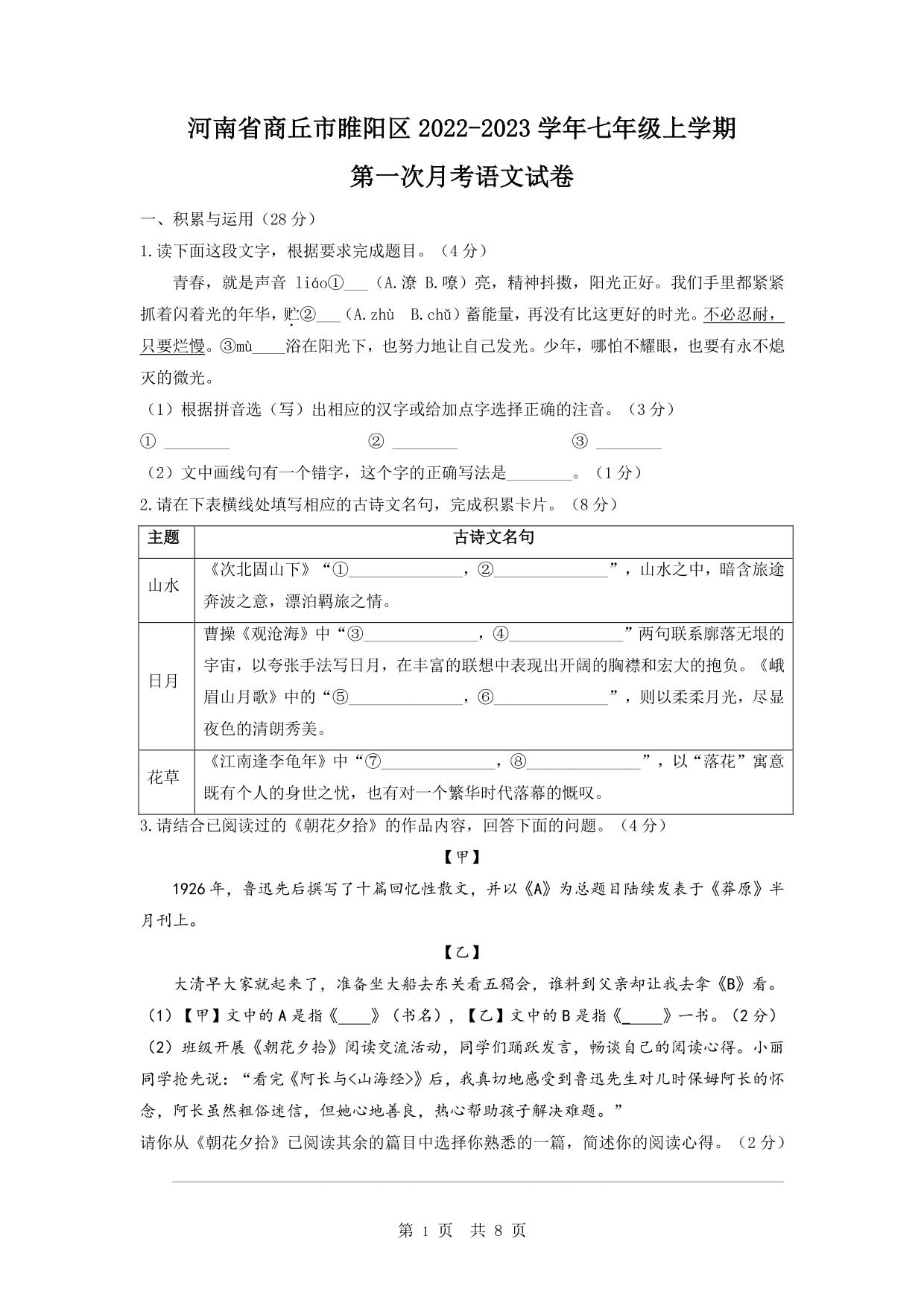河南省商丘市睢阳区2022-2023学年七年级上学期第一次月考语文试卷