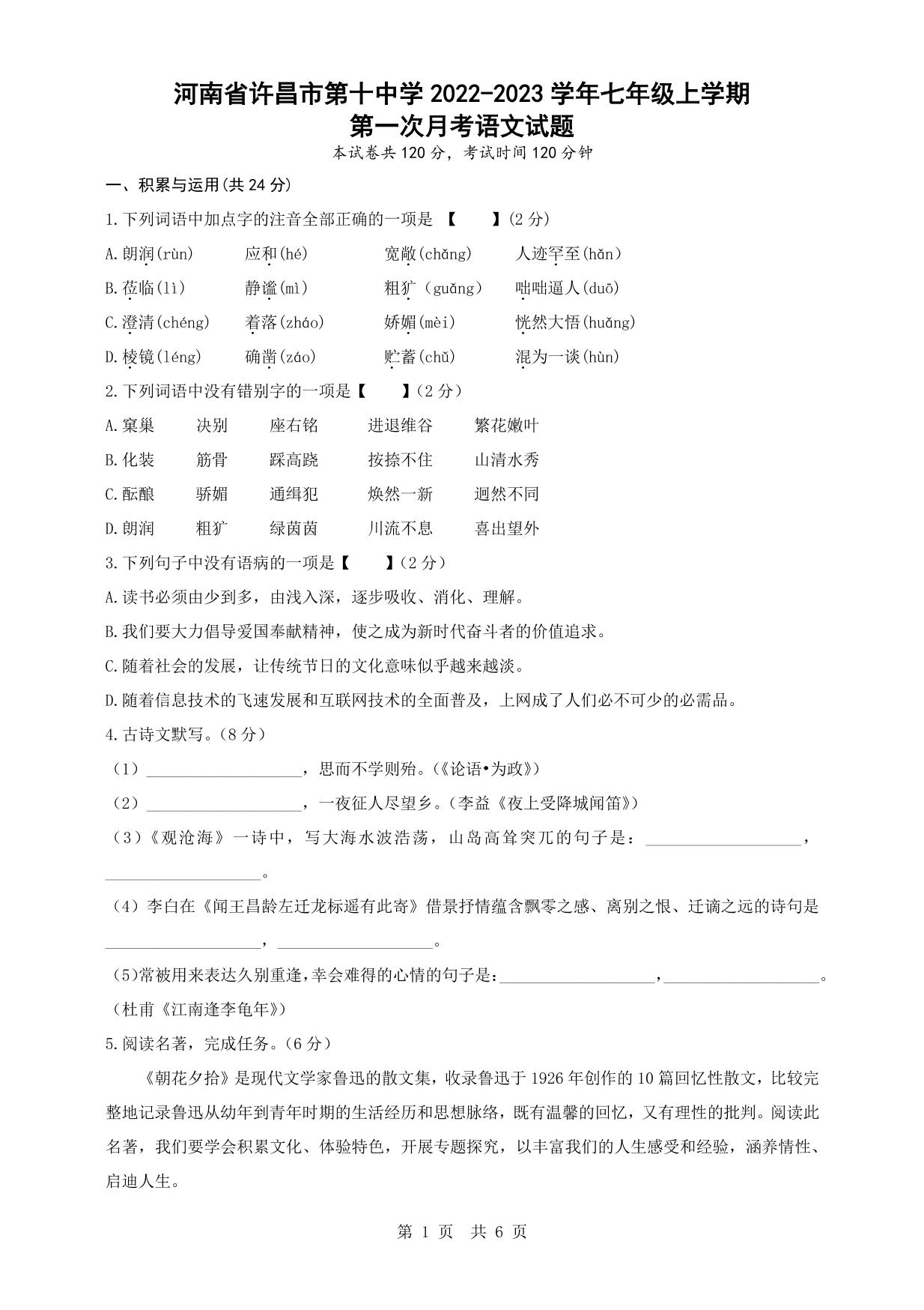 河南省许昌市第十中学2022-2023学年七年级上学期第一次月考语文试题