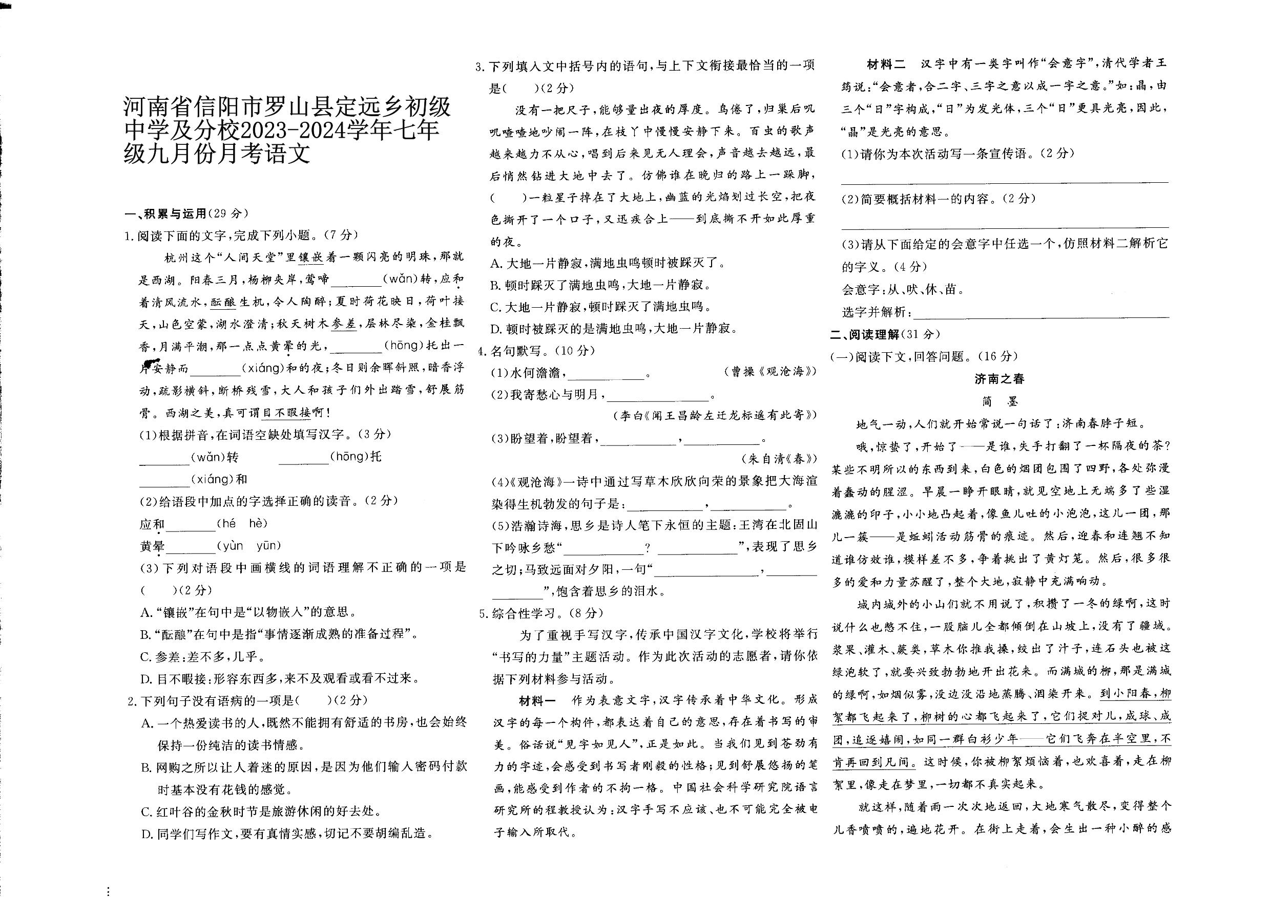 河南省信阳市罗山县定远乡初级中学及分校2023-2024学年七年级九月份月考语文试题