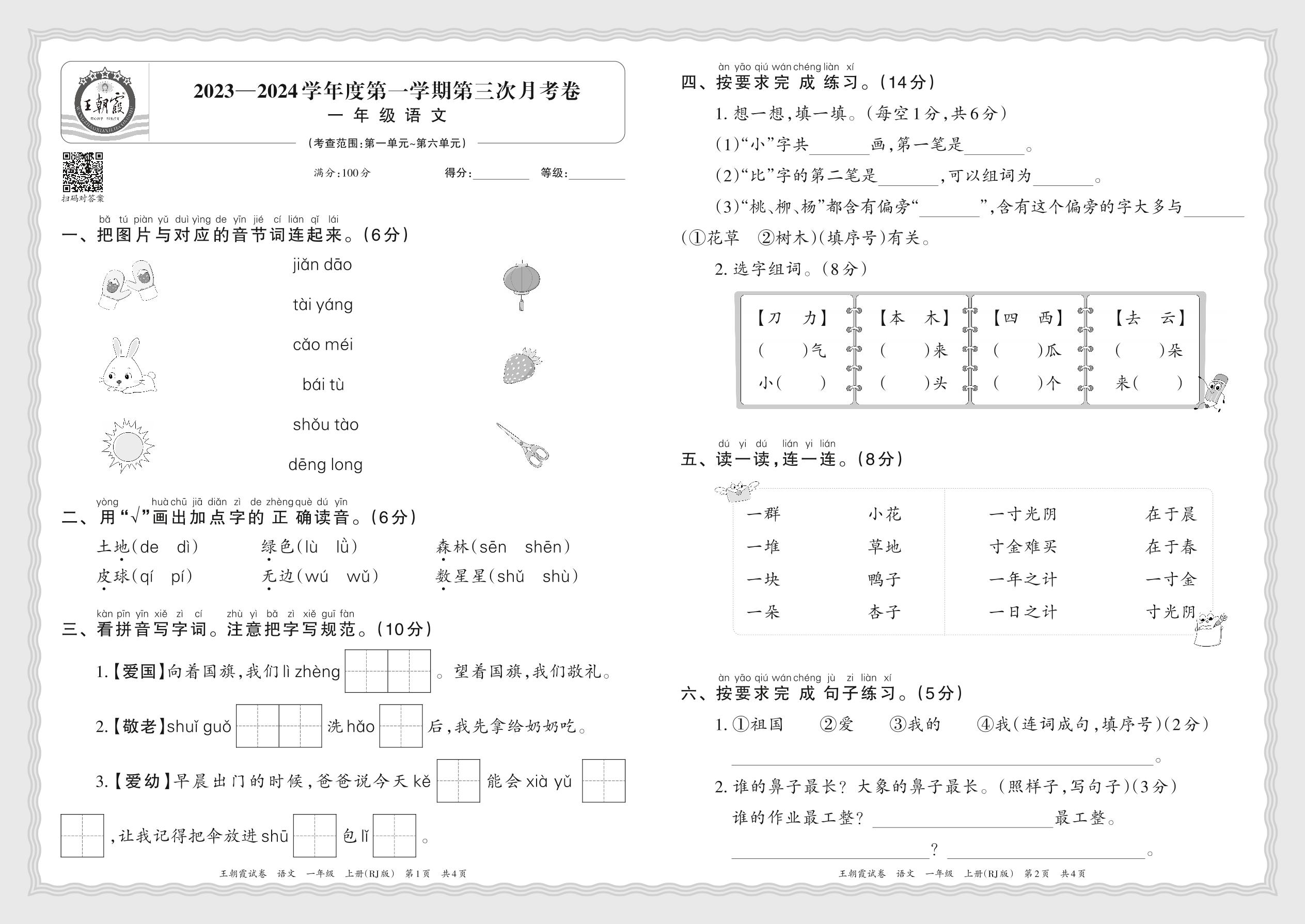 2023—2024学年度第一学期第三次月考卷一年级语文(人教版)