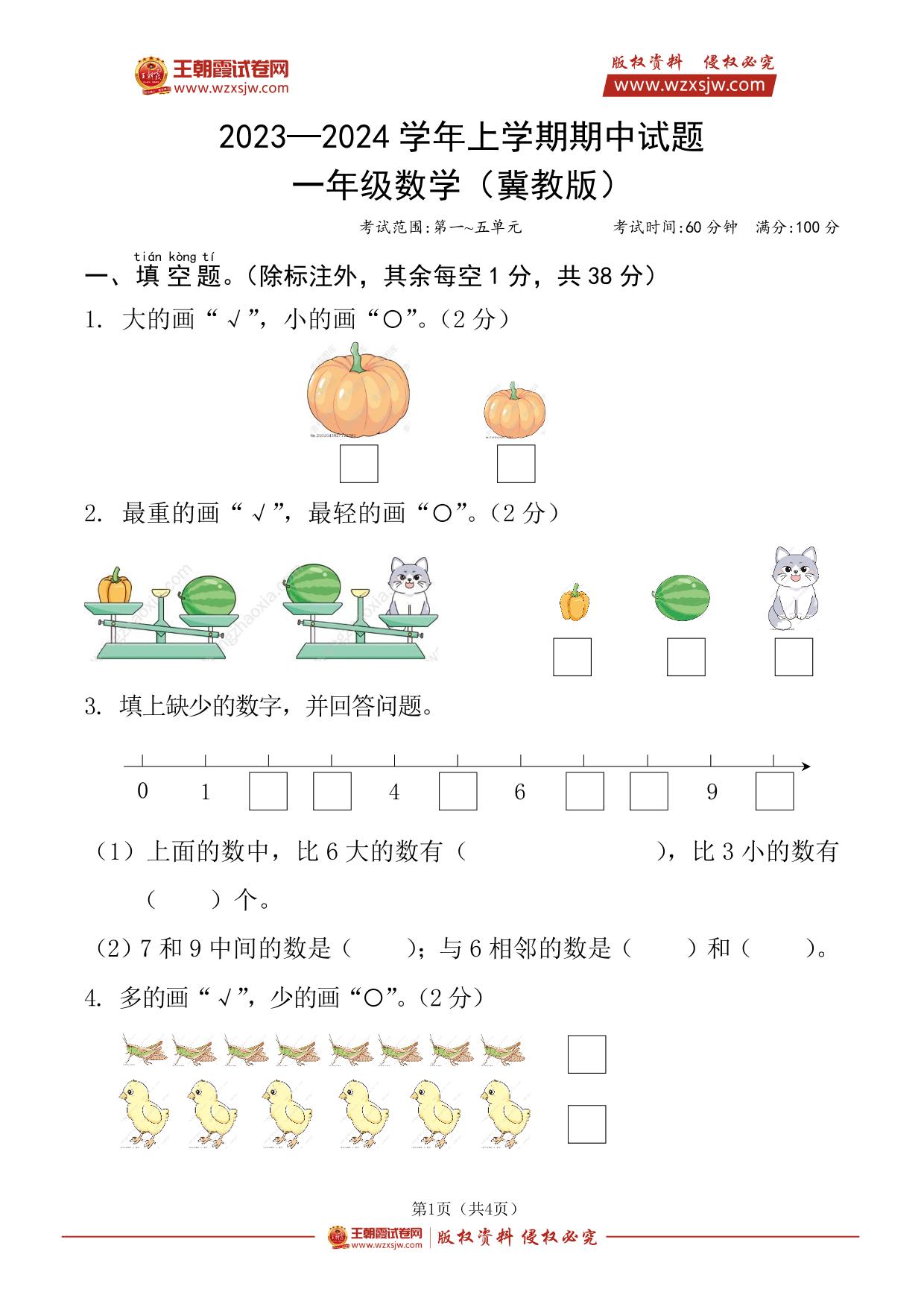 2023—2024学年上学期期中试题一年级数学(冀教版)