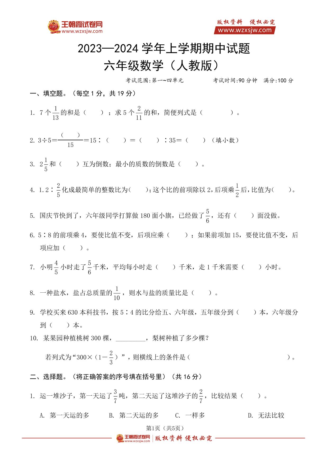 2023—2024学年上学期期中试题六年级数学(人教版)