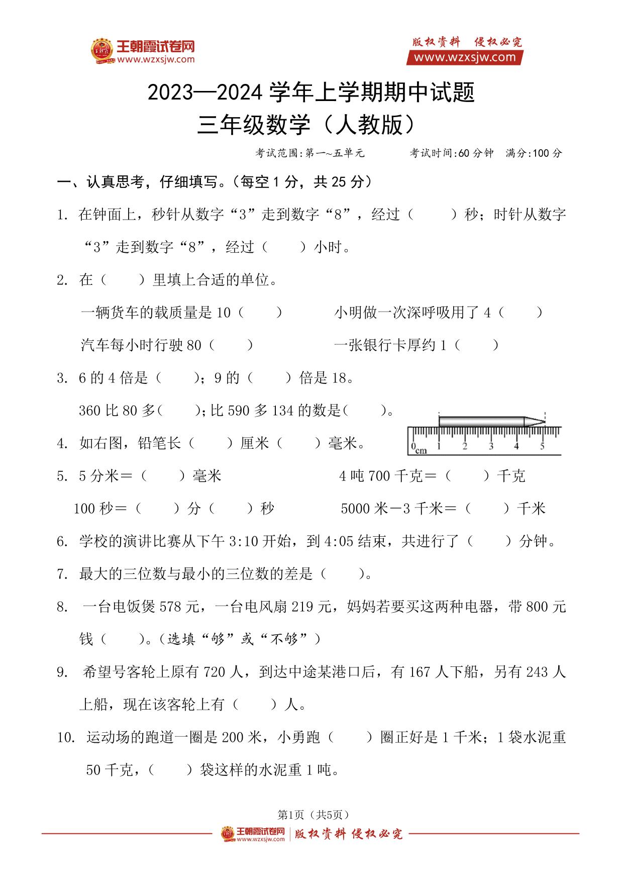 2023—2024学年上学期期中试题三年级数学(人教版)