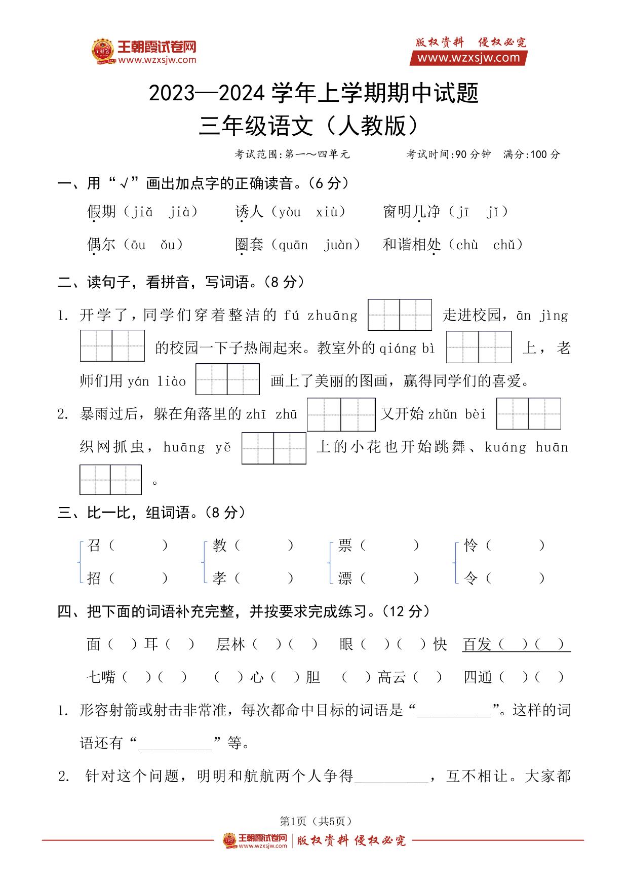 2023—2024学年上学期期中试题三年级语文(人教版)