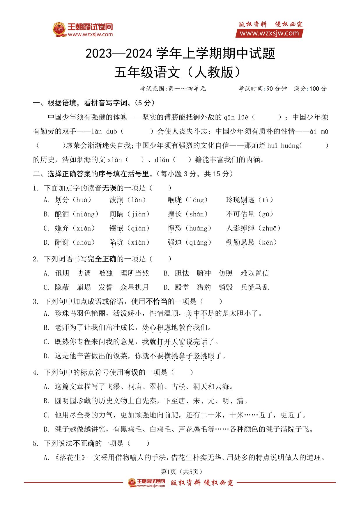 2023—2024学年上学期期中试题五年级语文(人教版)