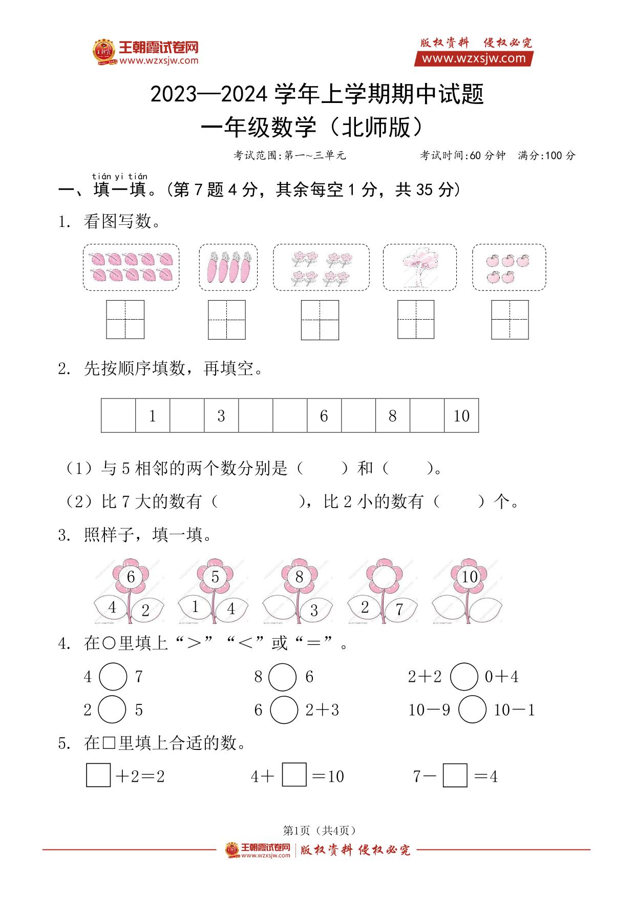 2023—2024学年上学期期中试题一年级数学(北师版)