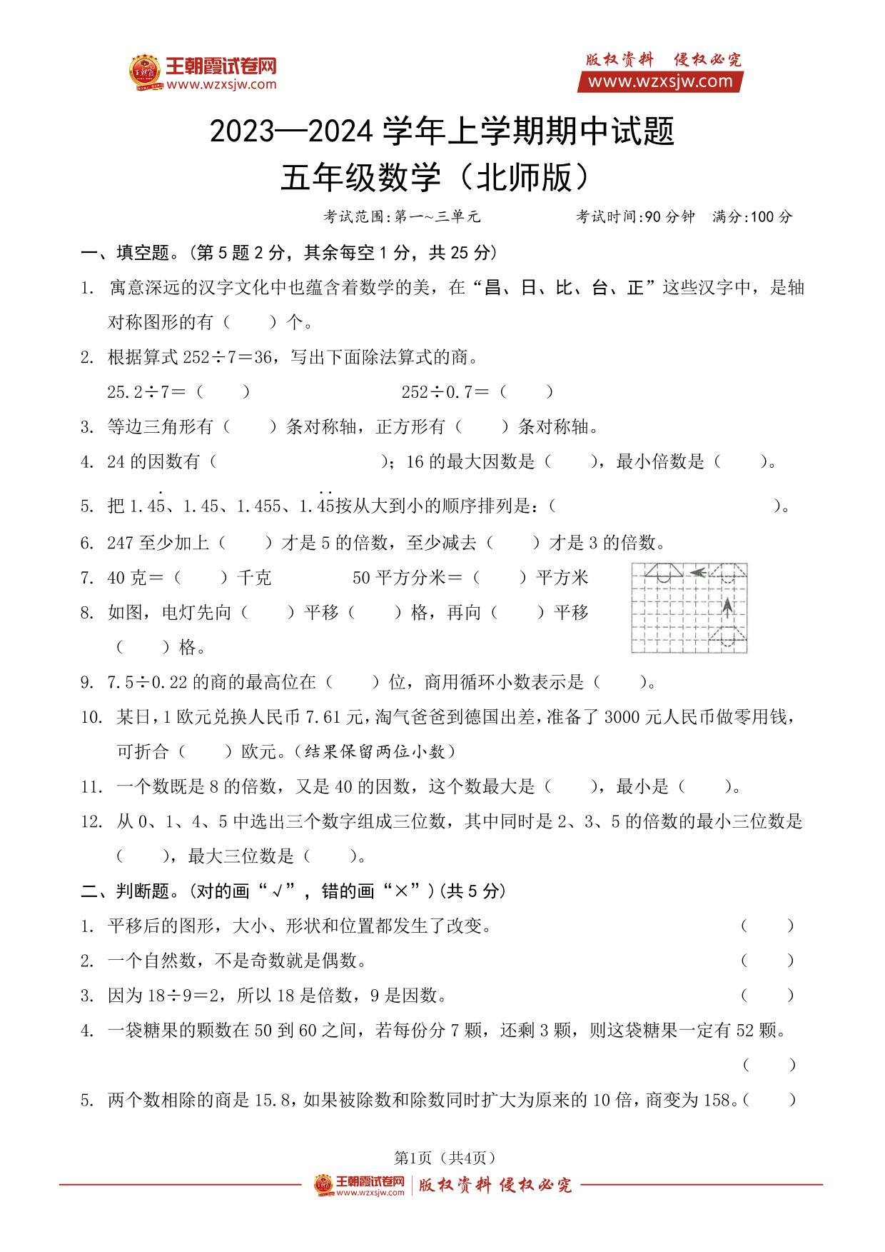 2023—2024学年上学期期中试题五年级数学(北师版)