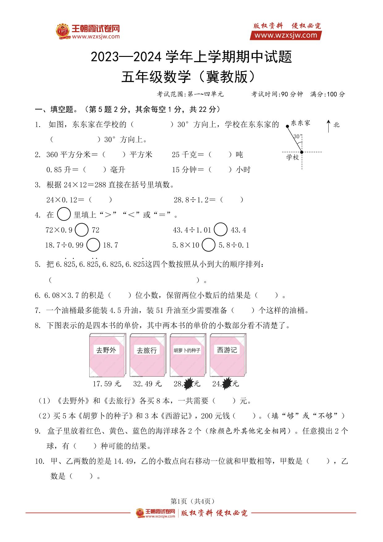 2023—2024学年上学期期中试题五年级数学(冀教版)