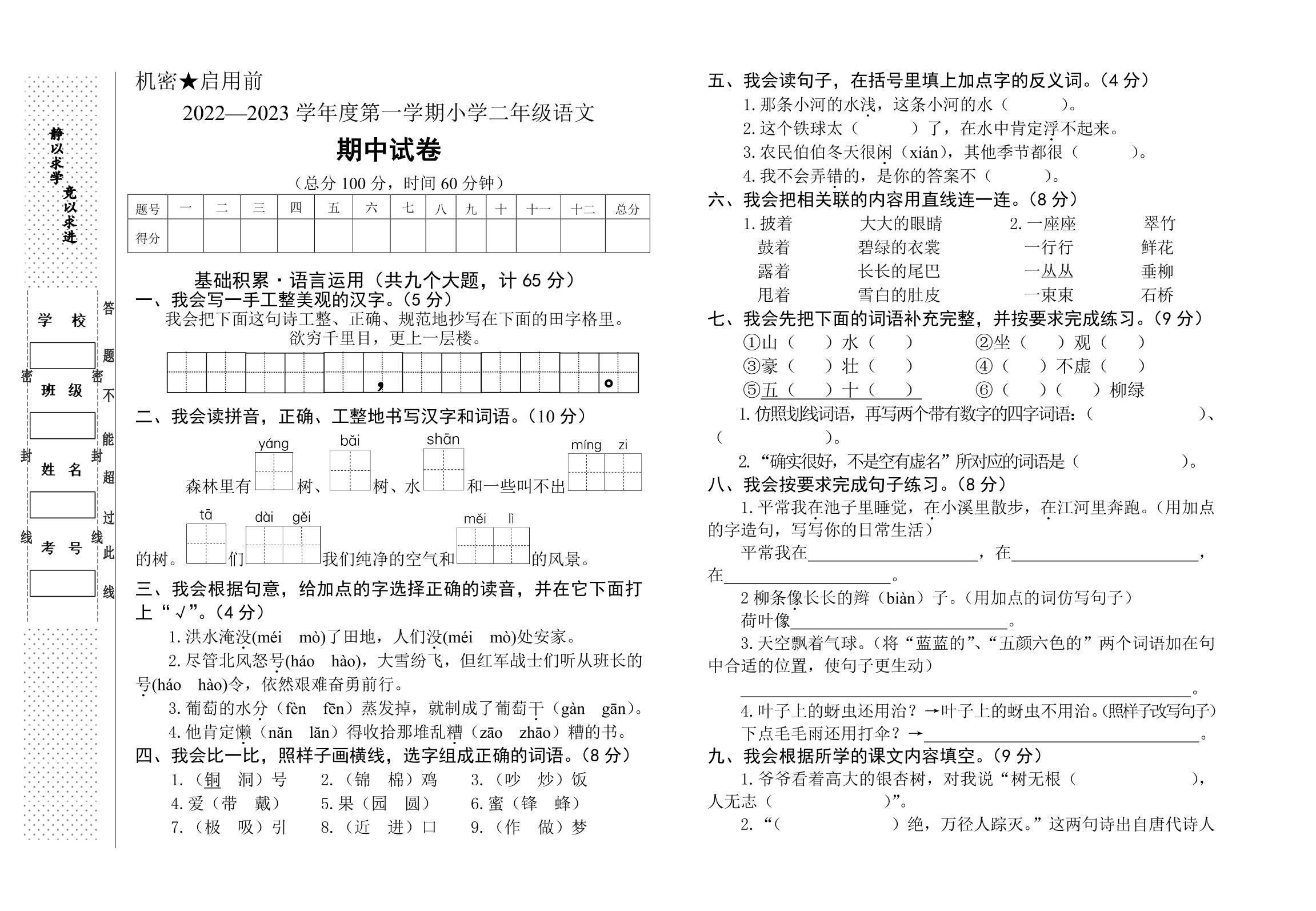 湖北省天门市2022-2023学年上学期期中试题二年级语文(人教版)