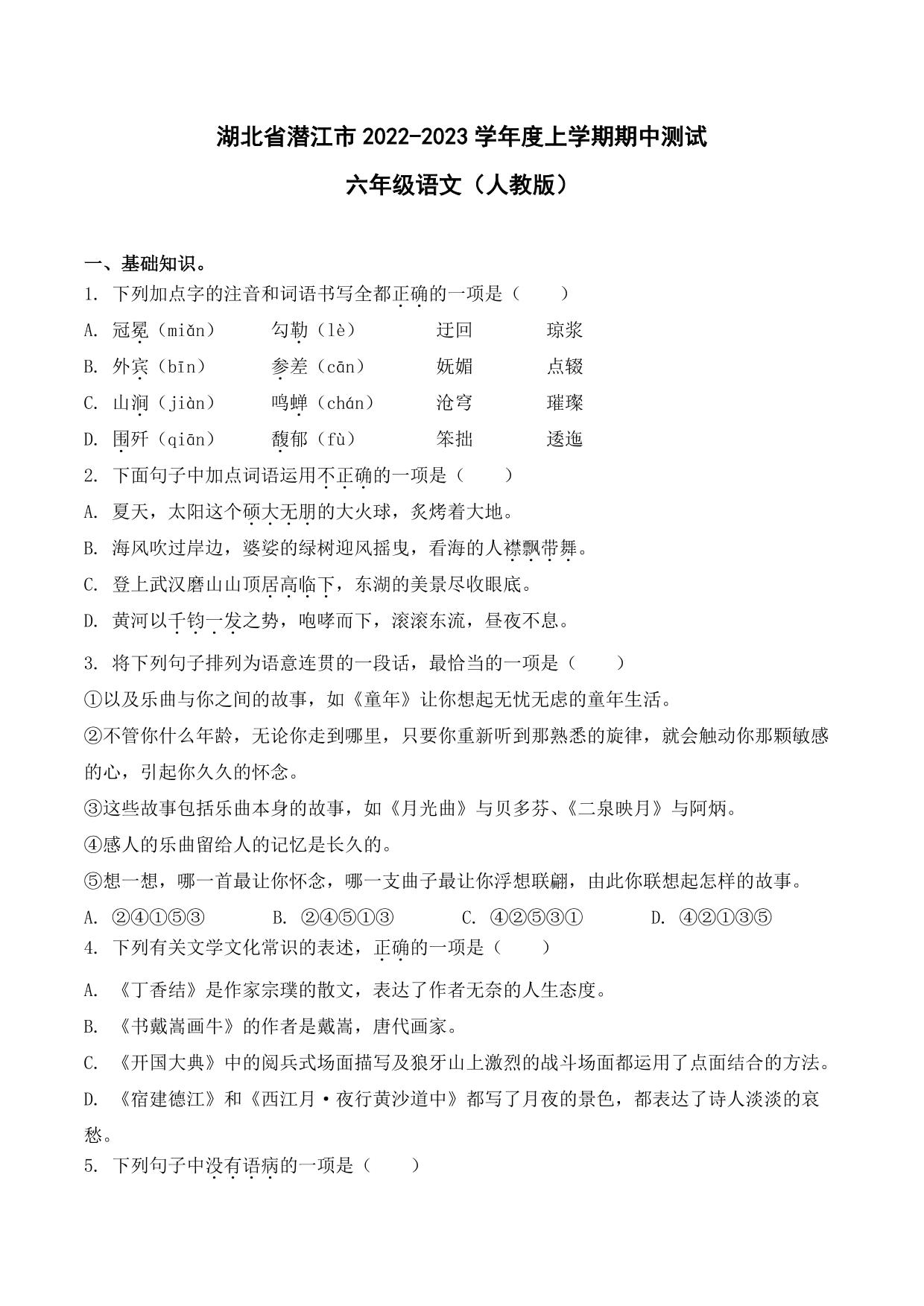 湖北省潜江市2022-2023学年度上学期期中测试六年级语文(人教版)